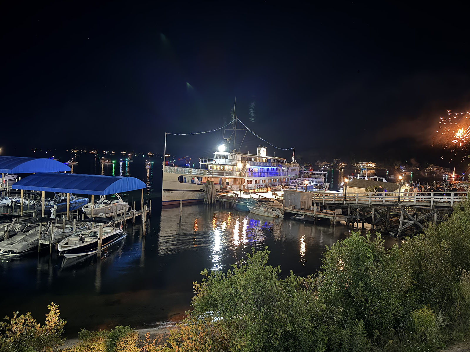 The webmaster’s new iPhone 16 Pro Max takes great nightime pictures. Compare the quality of this picture of the fireworks, taken on August 31, 2025, with the previous, similar photo, taken 13 years earlier. Once again, the Mount is seen at the dock, while the colorful lights of a fleet of private boats is seen out on the lake.