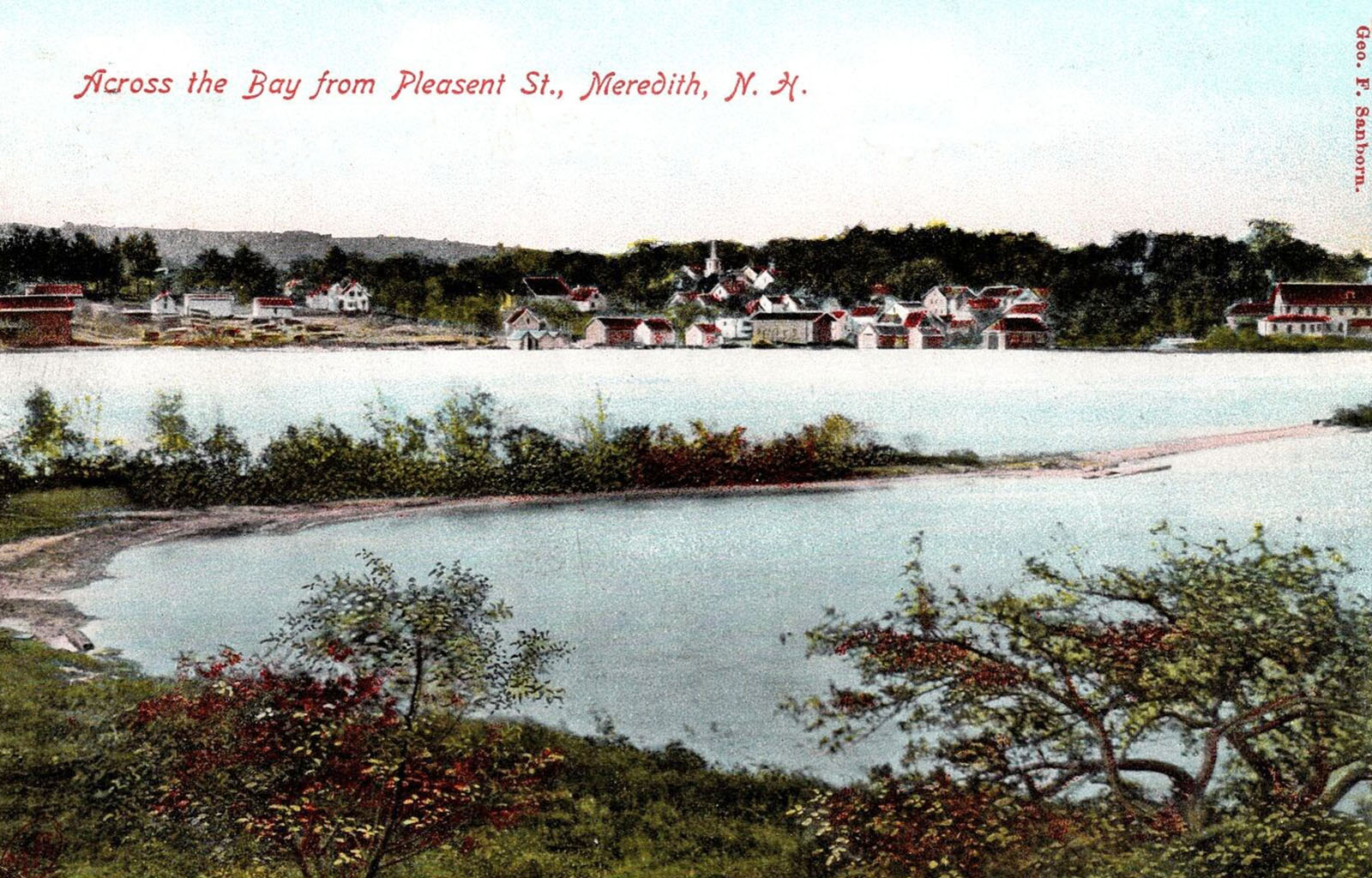This old postcard, predating Clough Park, shows the Meredith waterfront still in its natural wetland state. The Old Oak is seen at the center of the postcard. The Main Street of the 1889 map has been renamed Winnipesaukee Street.