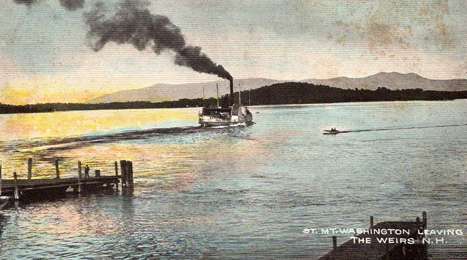 All of the postcards and photos on this webpage show the Mount Washington Steamship LEAVING Weirs Beach. Click here to see many views of the Mount Washington Steamship APPROACHING Weirs Beach, as well as various other towns around Lake Winnipesaukee.