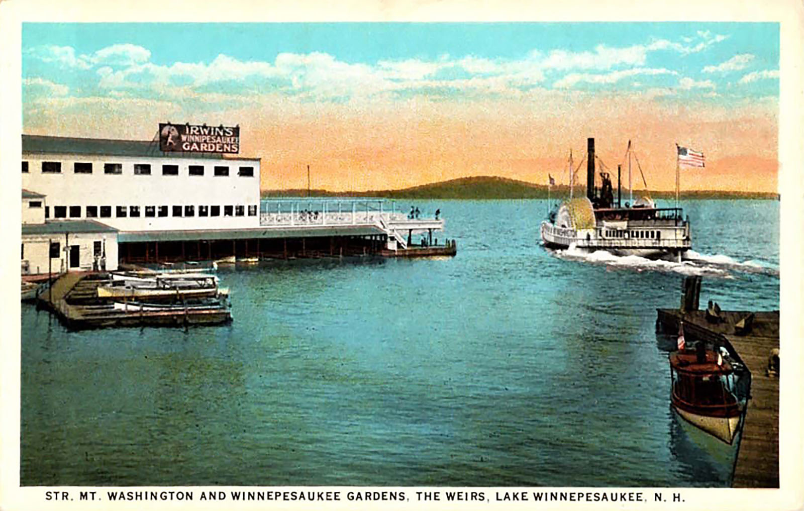 All of the historical postcards on this webpage show the Mount Washington steamship leaving Weirs Beach. Click here to see many views of the Mount Washington steamship approaching Weirs Beach, as well as various other towns around Lake Winnipesaukee.