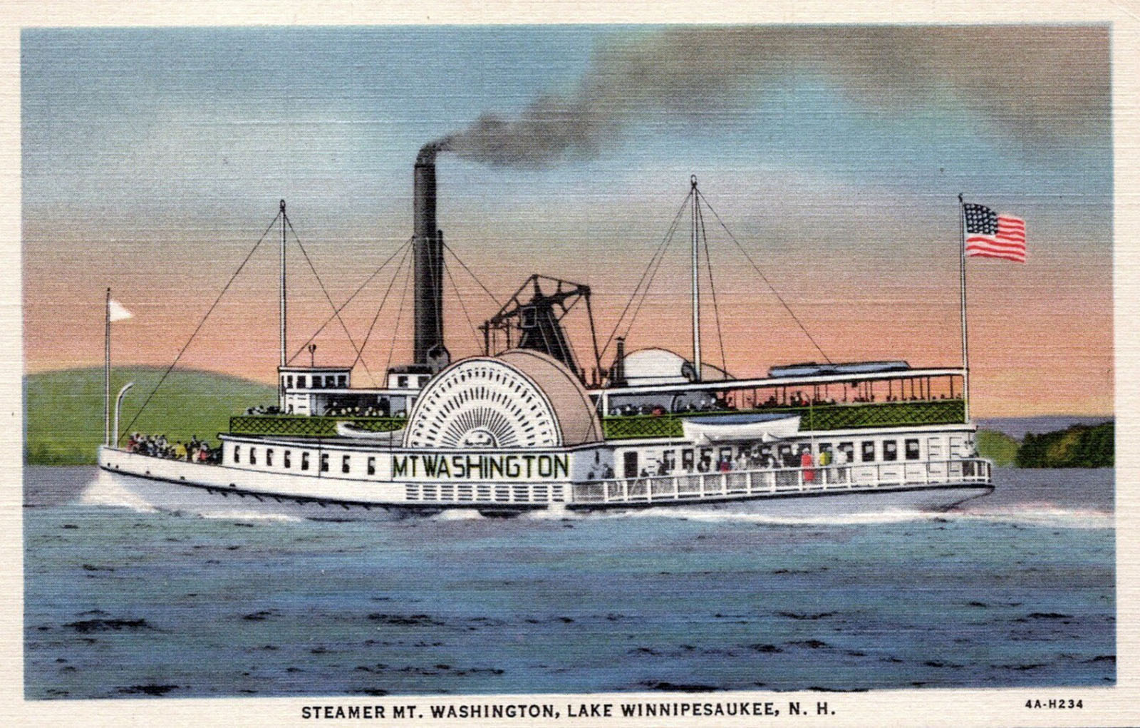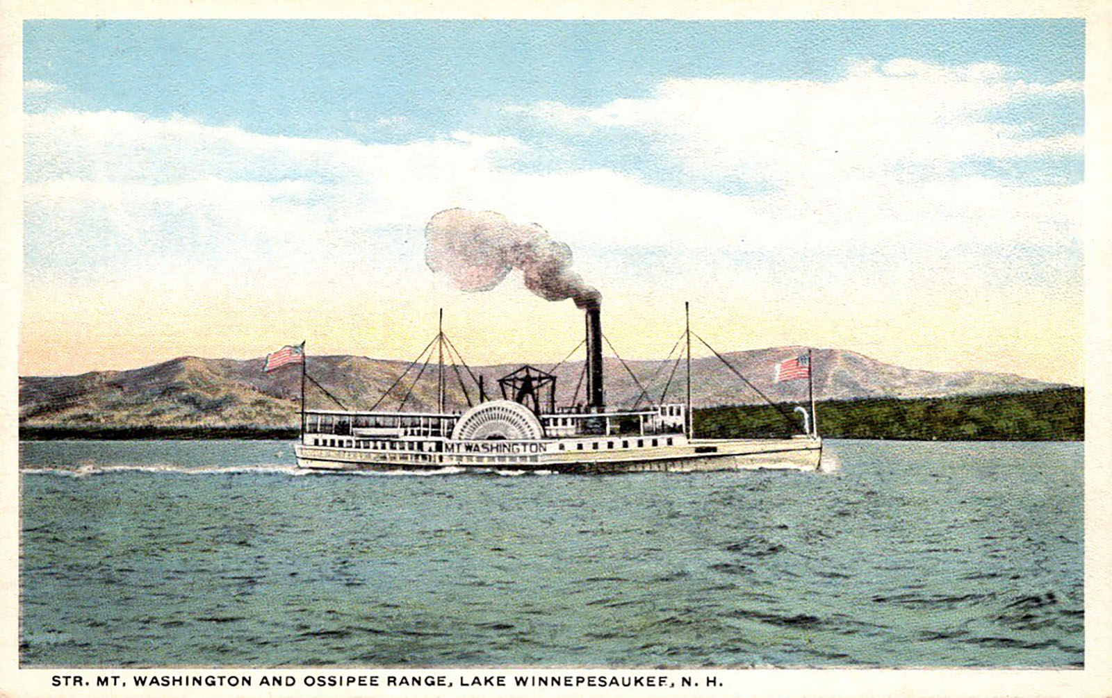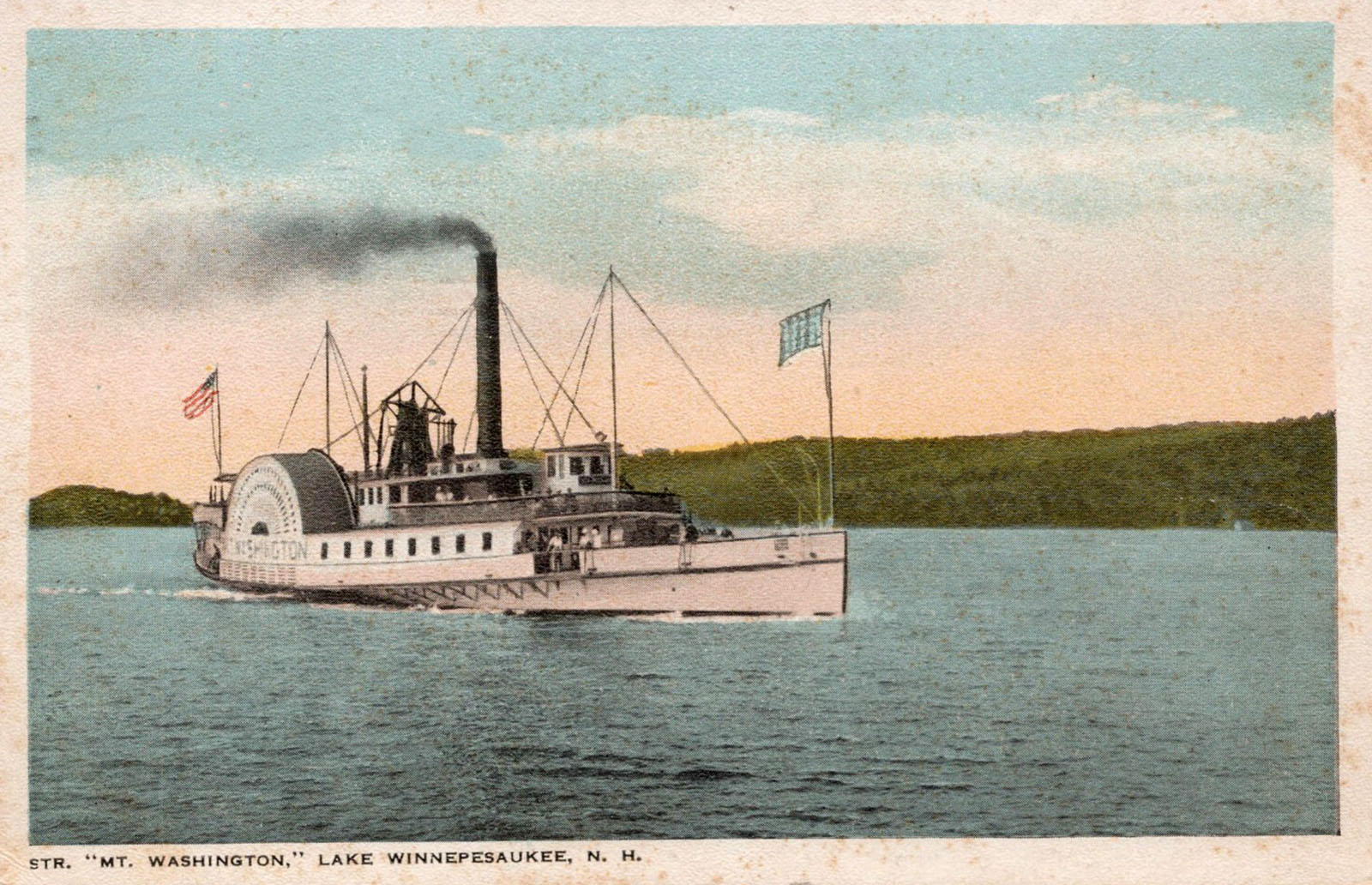 The next three photos show the Mount Washington run aground on One Mile Island in Center Harbor. The low-speed accident occurred in a fog, early in the season of 1910, and resulted in no damage to the vessel, although it took two days to dislodge her from her unintentioned berth.
