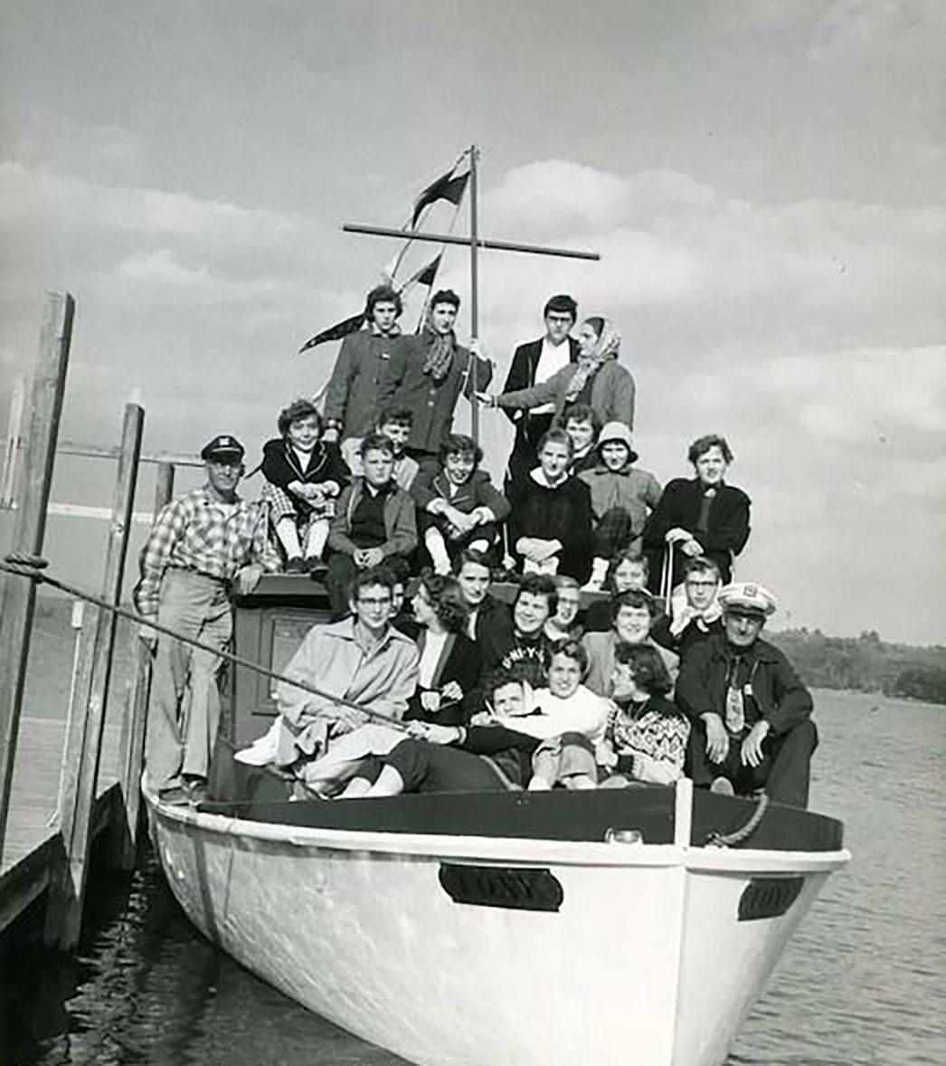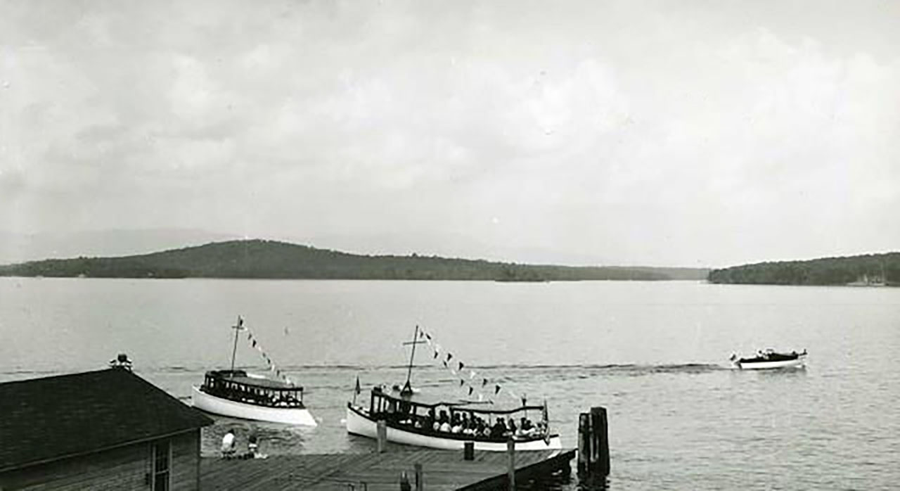 The Foxy boat service began in 1945, but the Foxy boat itself may have been much older. This photo shows a boat named the Foxy with the original Mount Washington steamer in the background of the photo, dating the Foxy to 1939 or earlier. However, this Foxy has a steam pipe. The modern Foxy boats were diesel driven.