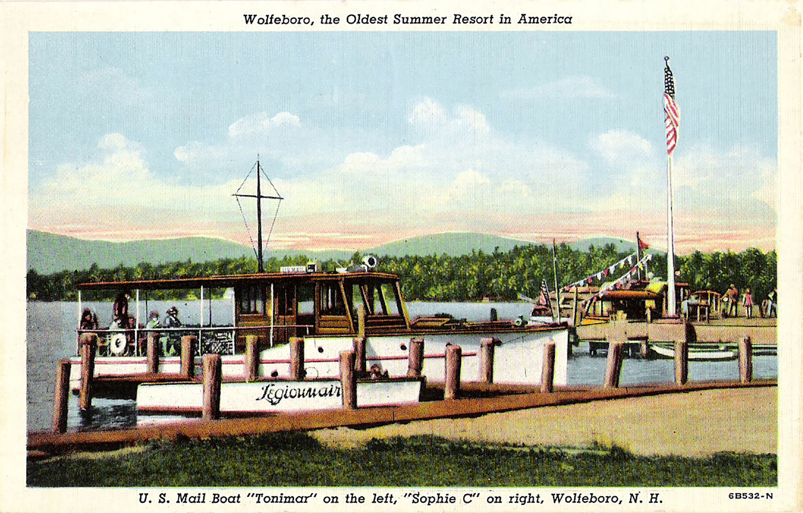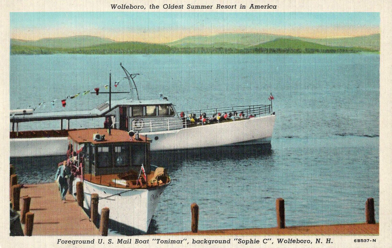 The Tonimar delivered mail out of Wolfeboro beginning in 1941 and ending in 1966. This postcard shows the Legionnaire speedboat in front of the Tonimar, and the Sophie C. behind.