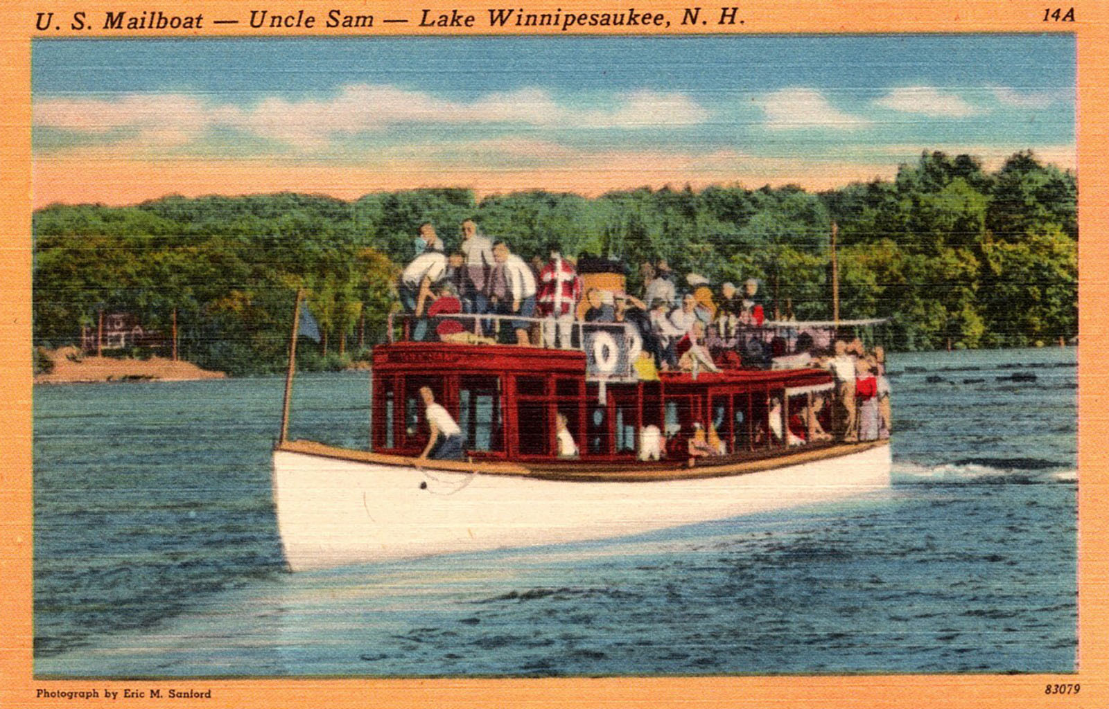 In 1916, an act of Congress made the Uncle Sam the only official floating post office on an inland water body in the USA. Mail was to be addressed to RFD No. 7, Laconia, NH, and to be cancelled with the stamp “Lake Winnipesaukee R.P.O.” The R.P.O. stood for Railway Post Office, and was meant for mail that was cancelled in transit, rather than at a stationary PO location.  (The R.P.O postmark was discontinued at the end of the 1978 season.)
