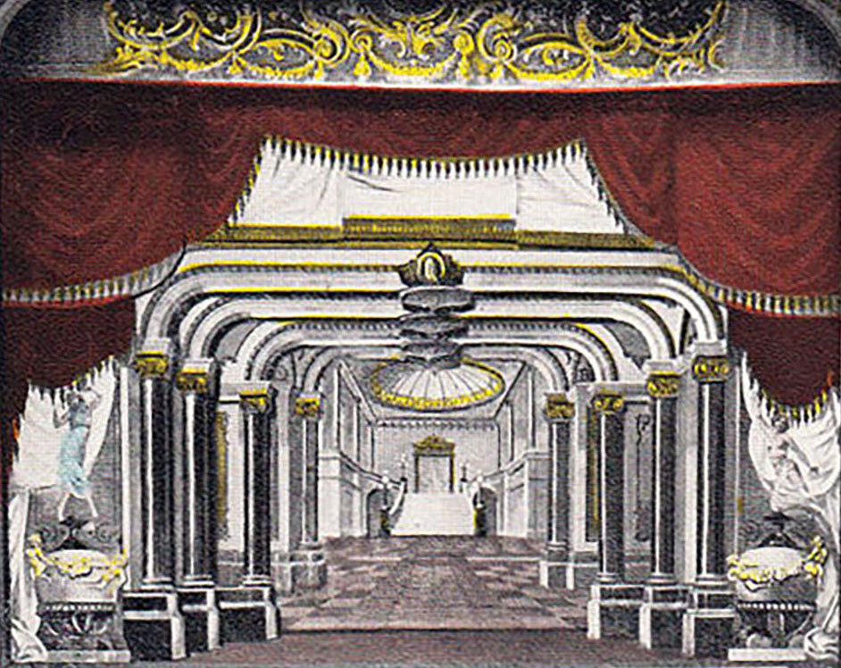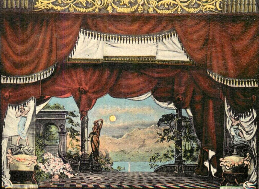 What looks like curtains below are not actual curtains. They are painted on the stage curtain to make the background scene look further away and more dramatic. The painted-on curtains are the same on these two details, while the background scene changes. This suggests that these curtains may have been used for different acts of the same play.