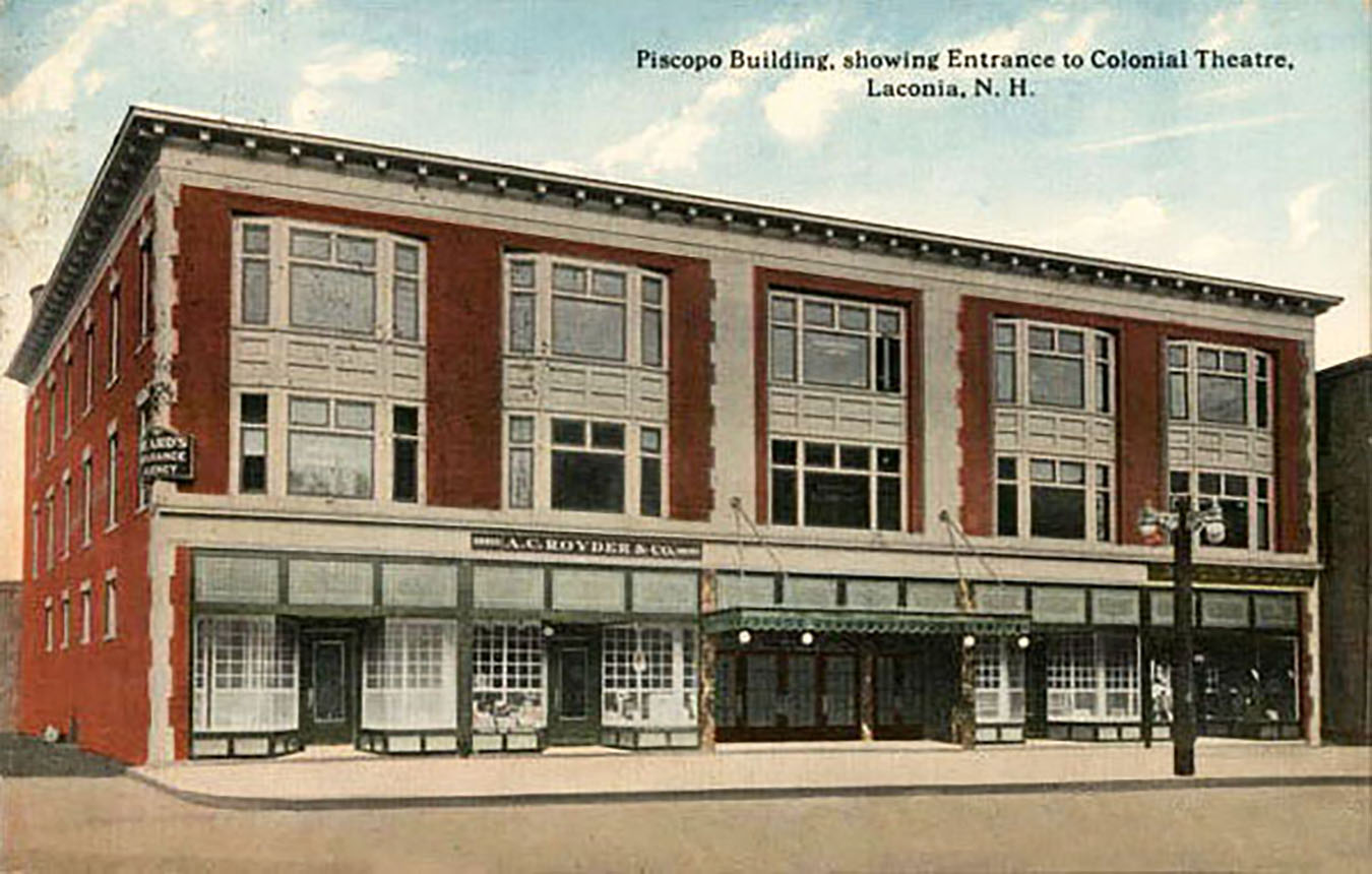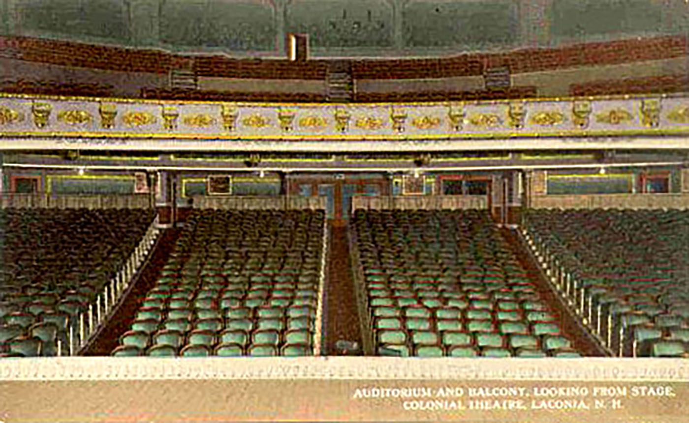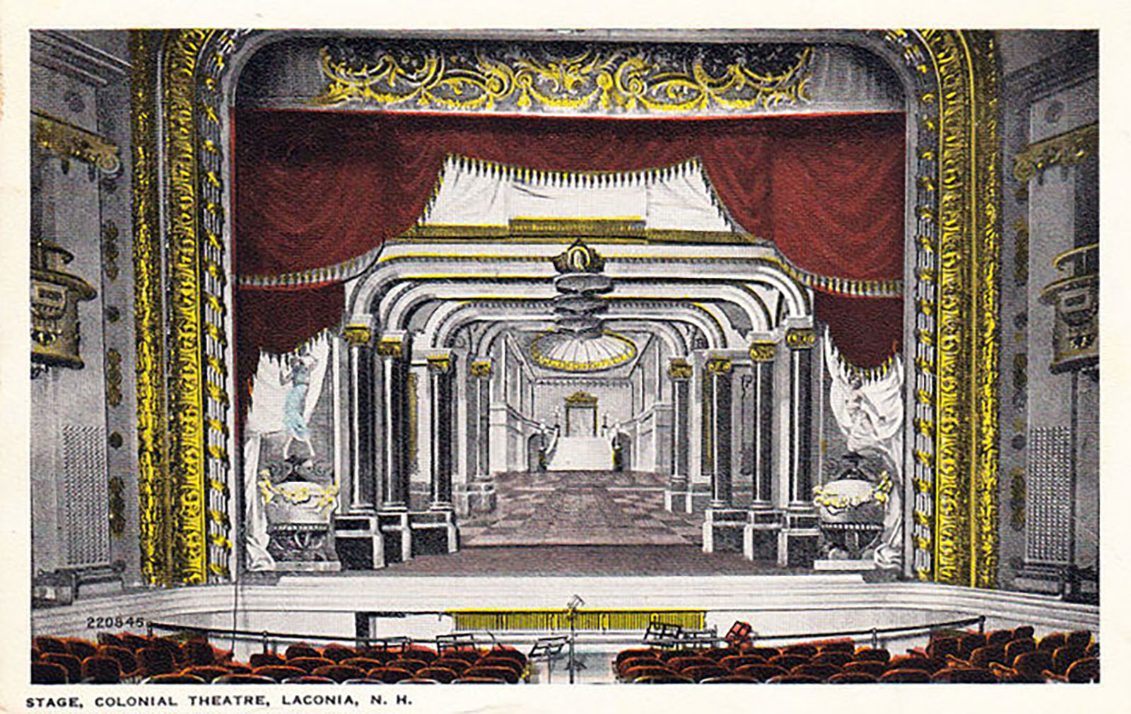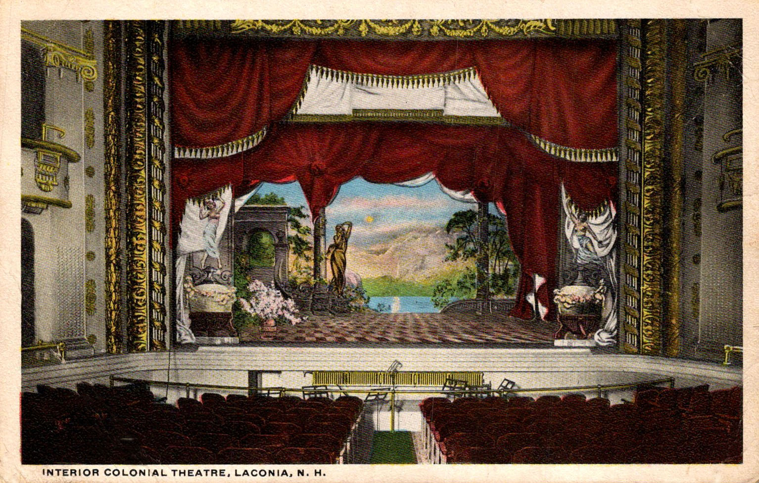 The Colonial Theatre’s fire curtain depicted a tranquil scene of Venice. Benjamin Piscopo, who built the theater, was originally from Venice. He emigrated to Boston and became a successful real estate developer. Around 1911, he moved to Laconia and hired George L. Griffin, a local architect, to design the theater building, which was completed in 1914. The three murals adorning the plaster around the stage were painted by artist Peter Holdensen (1868-1952), who had a studio at 154 Boylston St. in Boston. Holdensen may have painted the fire curtain as well, but this is not certain.