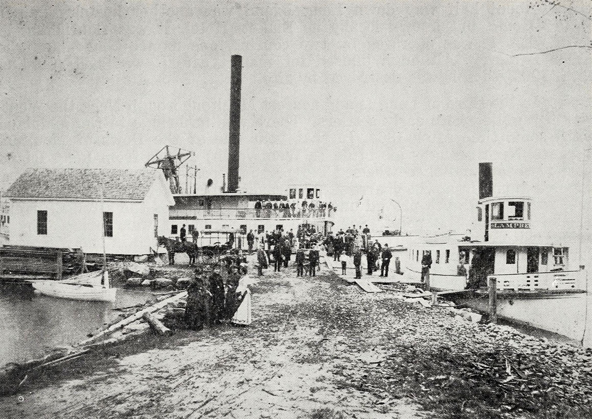 Photo of Lakeport from the 1890 “Leading Businessmen of Central NH” booklet. The photo is looking north at Paugus Bay. A similar photo can be found in Warren Huses’s book, “Lakeport”, on pages 60-61. The cruise ship in the center appears to be the Lamprey, see below. A wooden, boxed pony truss railroad bridge crosses the outlet of Paugus Bay in the lower left corner of the photo. This was the third Lakeport railroad bridge, built in 1873. Earlier wooden railroad bridges had burned in 1862 and 1872. A fourth, timber trestle bridge replaced the pony truss bridge in 1892. A fifth bridge, the Lakeport Drawbridge, replaced the center span in 1990, leaving the timber trestles on either side.