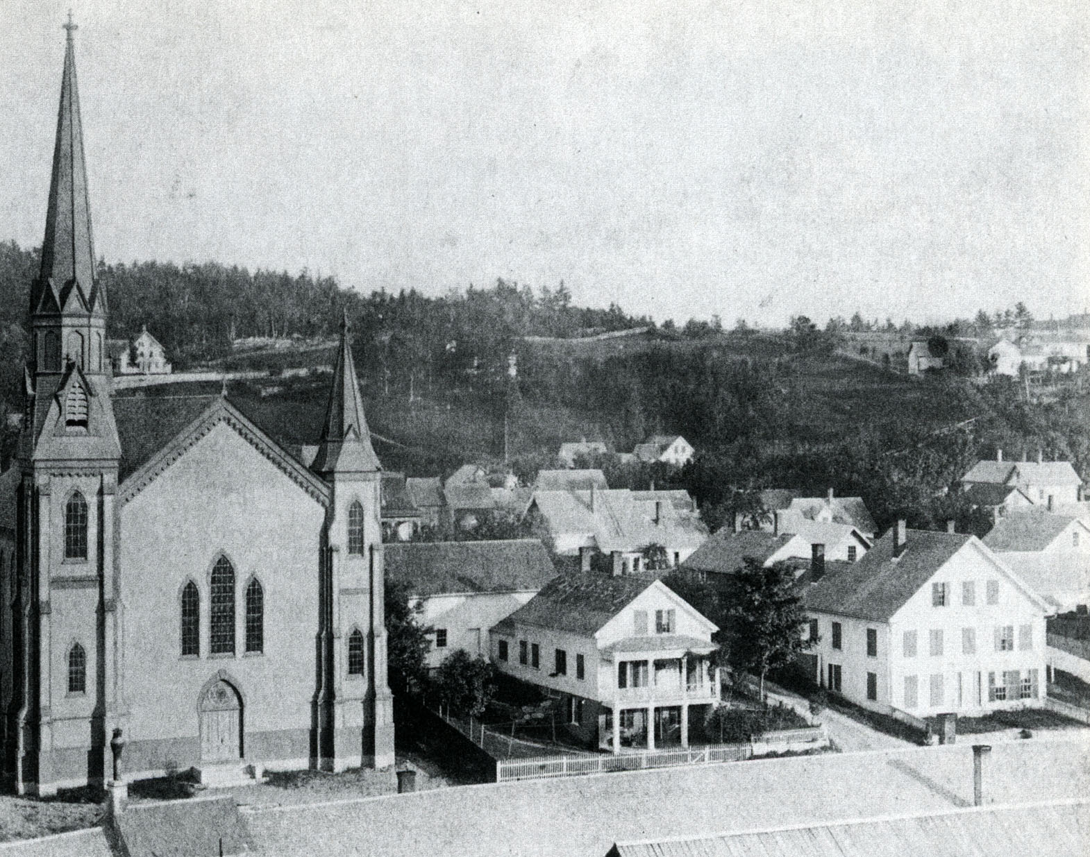 Another view from the top of the Opera House shows Lake Paugus and the Railroad Station, as well as the two nearby churches.