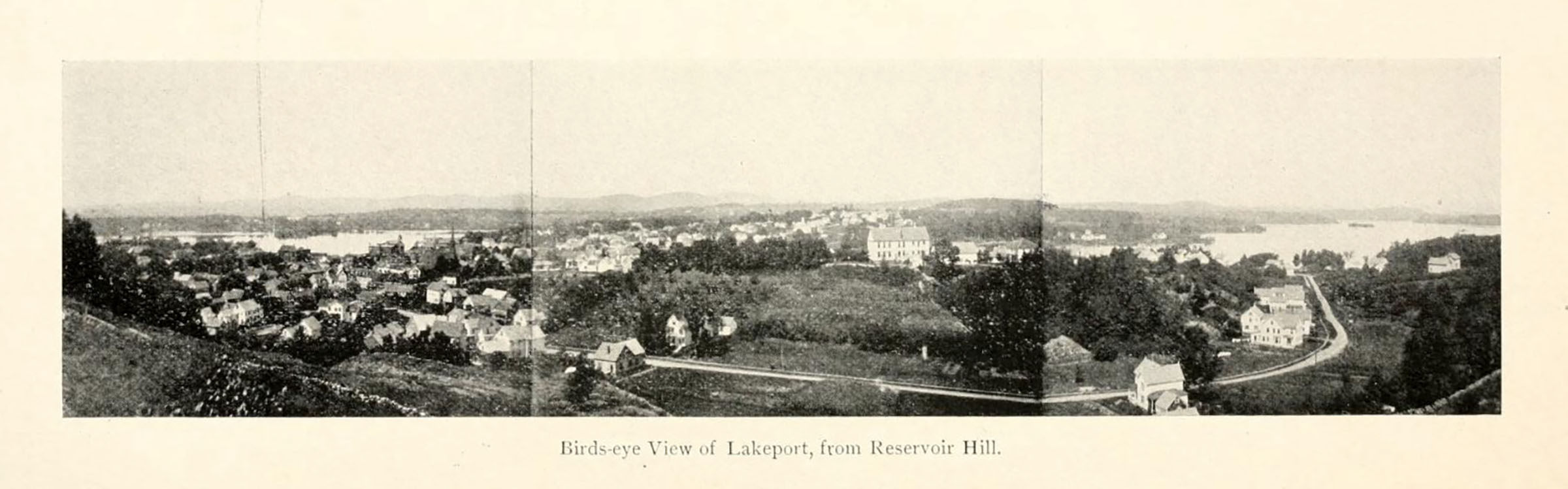 The above views from “Reservoir Hill” are not possible today. The hill, about 200′ above the lake, is now the site of Laconia’s Water Department Facility at 117 Stark Street. In the intervening years, trees have grown tall all around the facility, blocking the view. The facility treats and pumps the municipal water, obtained from an intake near the end of Paugus Bay. The facility stores the water in two huge water storage tanks, of 1.3 million and 2.0 million gallon capacity. The original Laconia waterworks was built in 1885, and featured an open, cobblestone reservoir, 21′ deep with a surface area of 153′ x 198′, and a capacity of 2.75 million gallons.