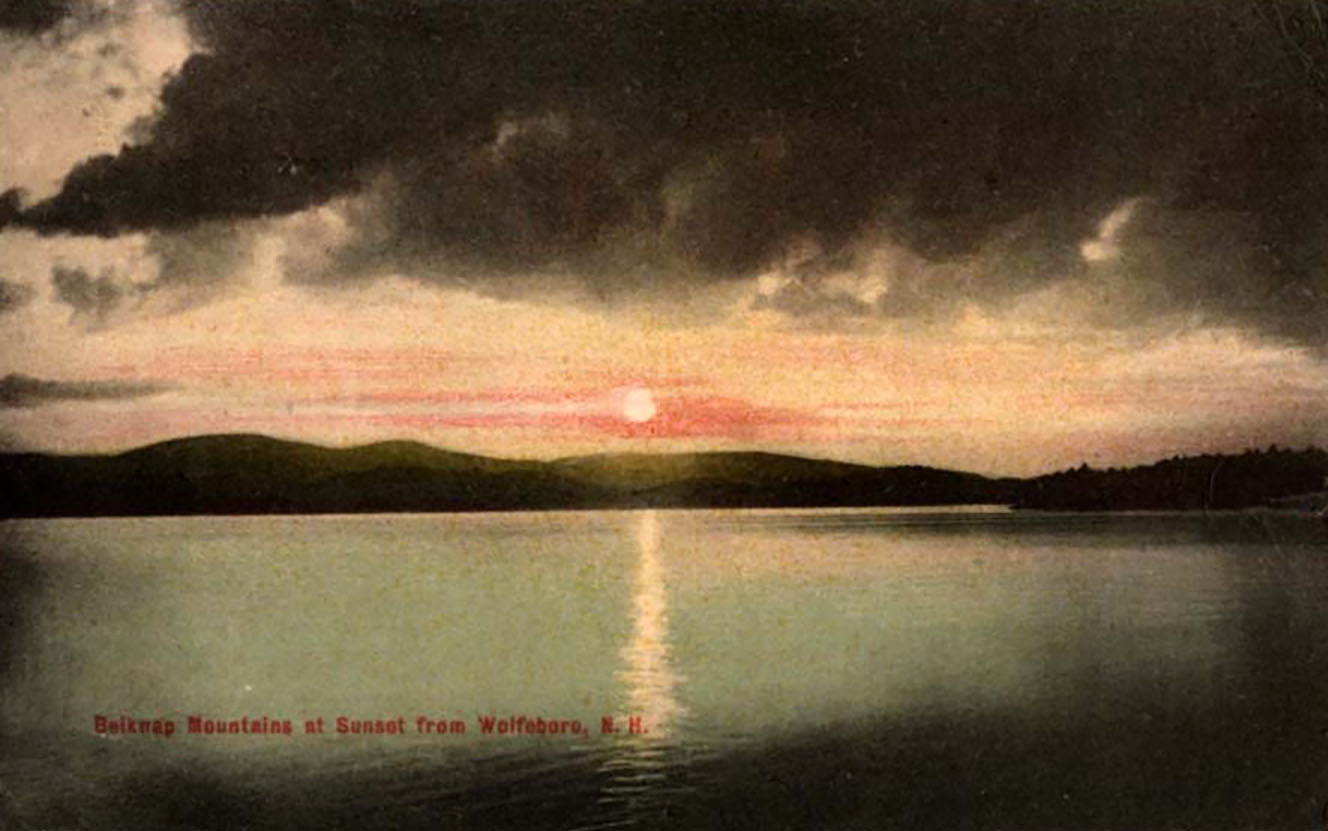 Below is a photo of the current stone bridge (built in 1932) over the Weirs channel, as viewed from Endicott Rock Park. From the pedestrian sidewalk that crosses the bridge on its north-facing side, there are fine views of Weirs Bay, and the best viewing angle from Weirs Beach of 6 of the 9 peaks of the Sandwich mountain range – Sandwich Dome, Mt. Tripyramid, Mt. Whiteface, Mt. Passaconaway, Mt. Paugus, and Mt. Chocorua (from l to r). For an absolutely spectacular panoramic view of the Weirs Bay, annotated with the names of all the individual peaks, click here. (Panorama courtesy of DCR)