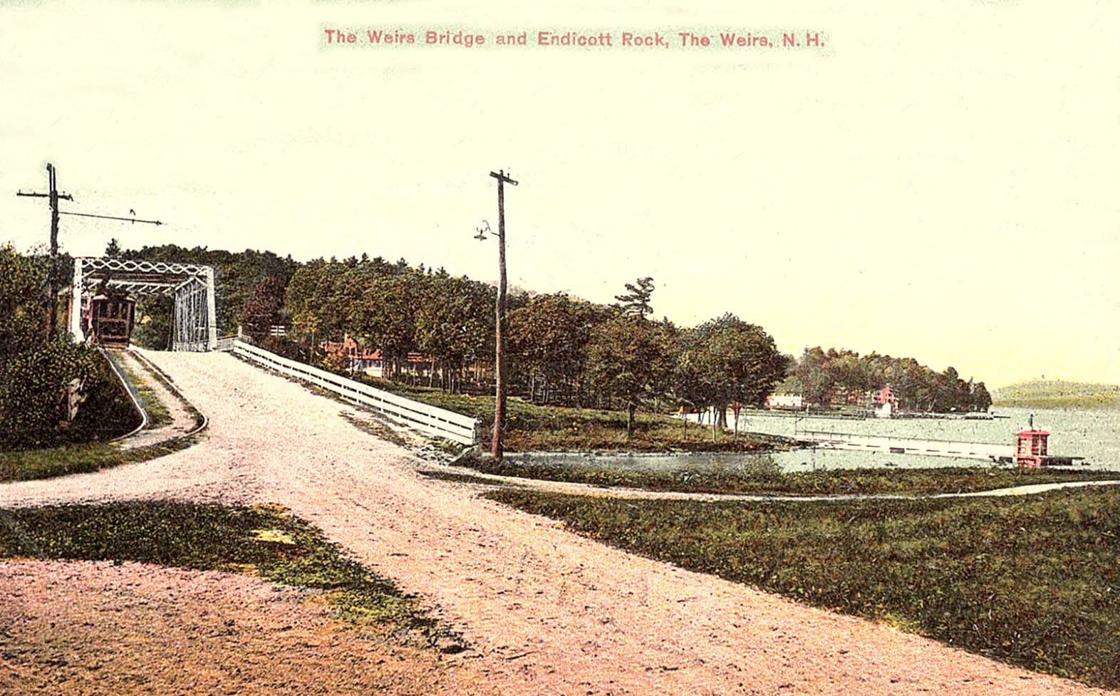 The Trolley crossed the Weirs Channel bridge on the Paugus Bay side of the bridge, leaving room on the Weirs Bay side for cars, horses, or pedestrians.
