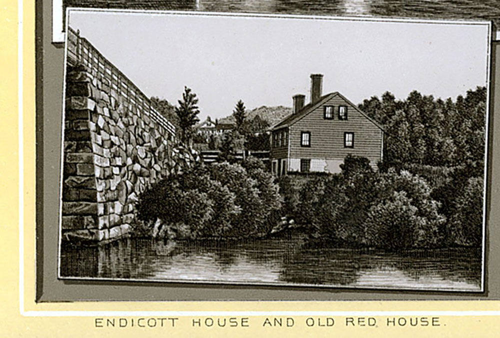 Below, a drawing of the channel bridge and what is supposed to be the Old Red House. The illustrator has mistakenly added a covering to the bridge. The illustrator probably based his drawing on the first Wilder stereoview above, which is taken at an angle that, at first glance, makes the bridge look covered.
