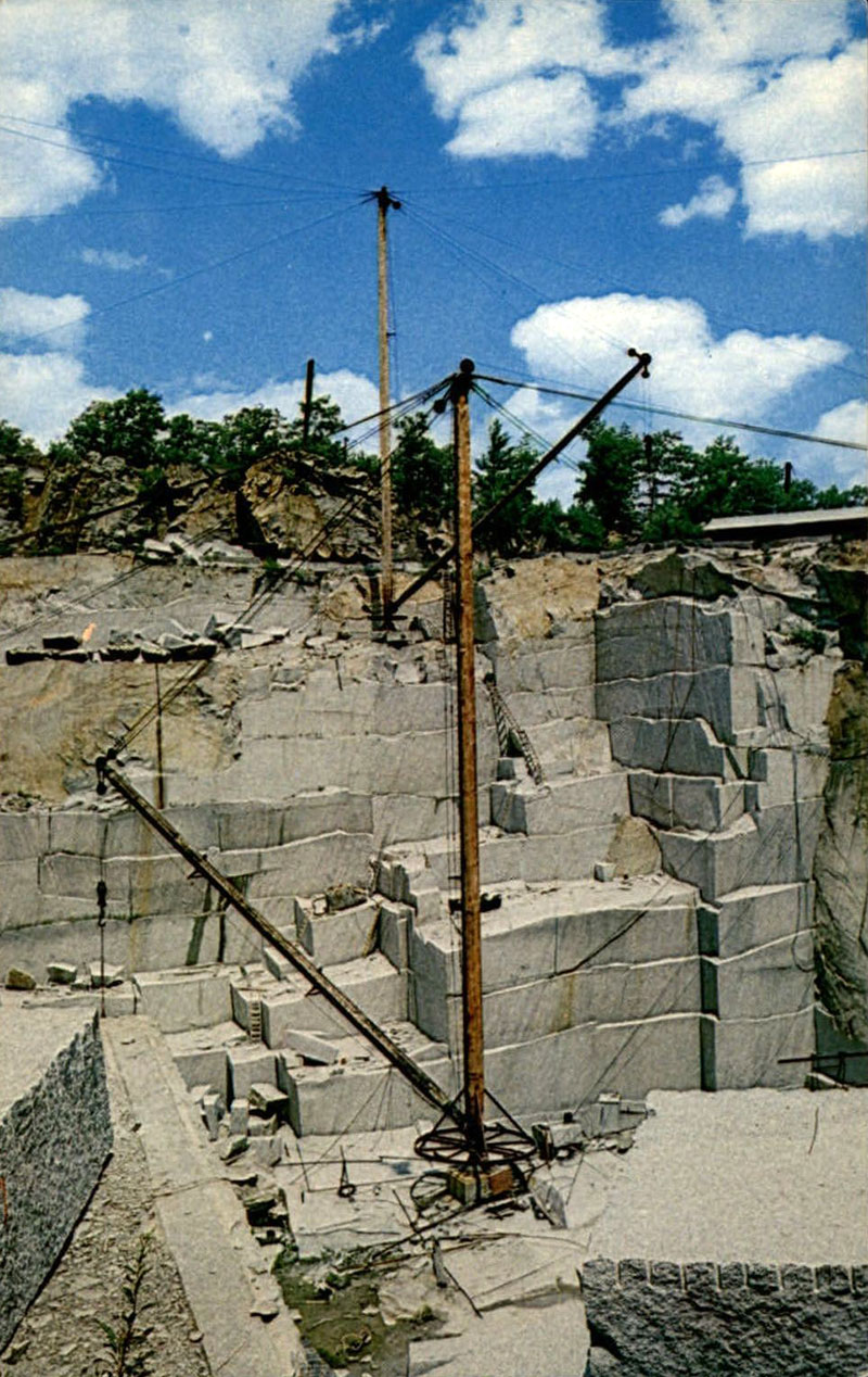 The granite facing was obtained from the John Swenson Granite quarry in Concord. It was “Ashlar Cut”, which means that the stone was cut to have a smooth, even facing with square sides. The granite facing was installed by Joseph Comolli, a Concord granite contractor. The John Swenson Granite Company, founded in 1883, still exists today, and is now known as Swenson Stone Works. Below is a postcard of the quarry.