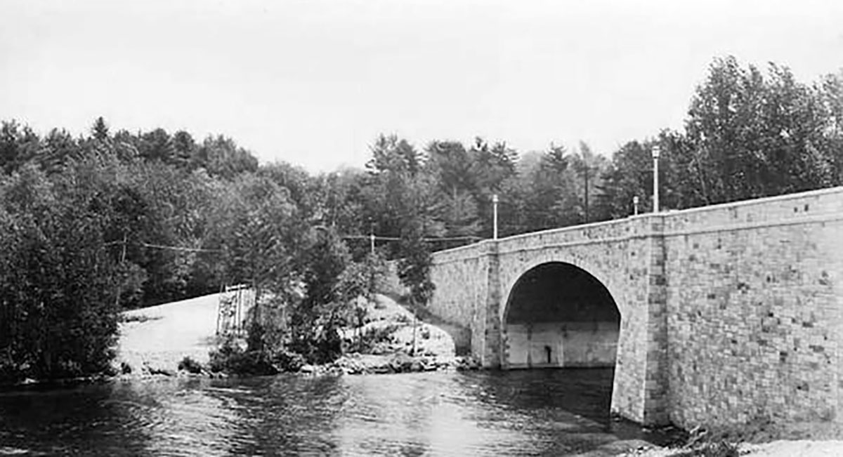 The Aquedoctan Stone Bridge in the mid 1930’s. Note the Victorian street lighting. The steel bridge to the Endicott Rock monument seen here was gone by 1938.