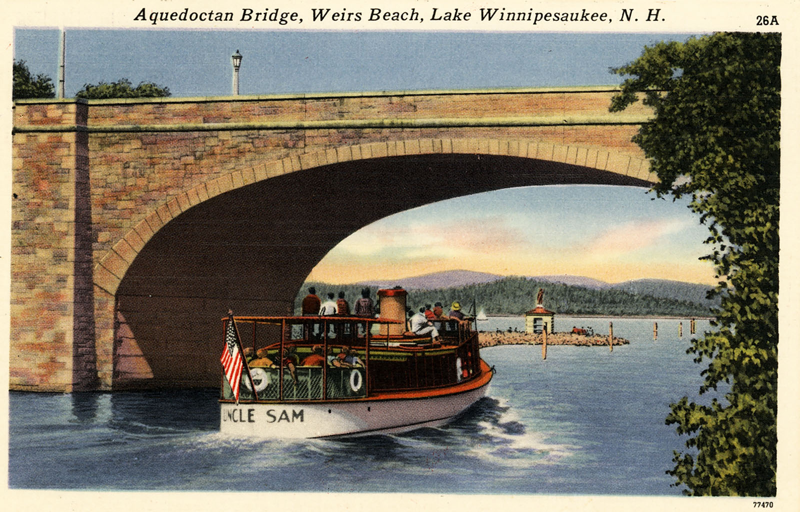 Below, a July 19, 1937 photo of the Endicott Rock Monument, Weirs Channel and Aquedoctan Stone Bridge. Taken from the Uncle Sam.