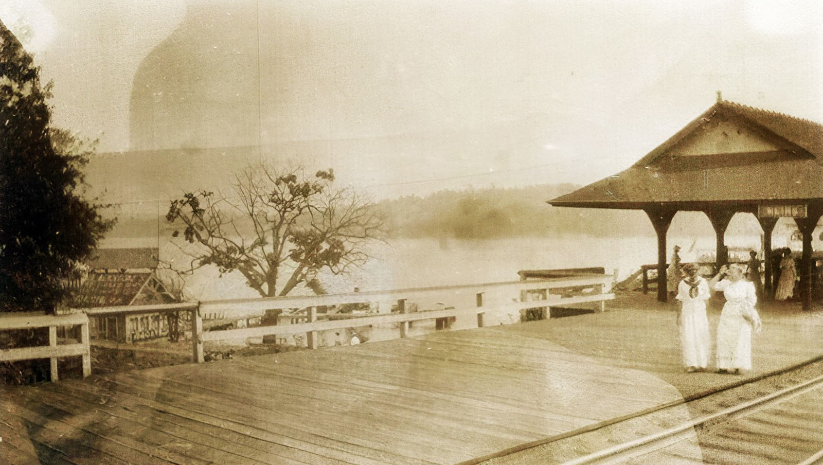 Looking down the boardwalk from the vicinity of the Station Master’s house, circa 1885. The second train station is visible in the distance on the left.