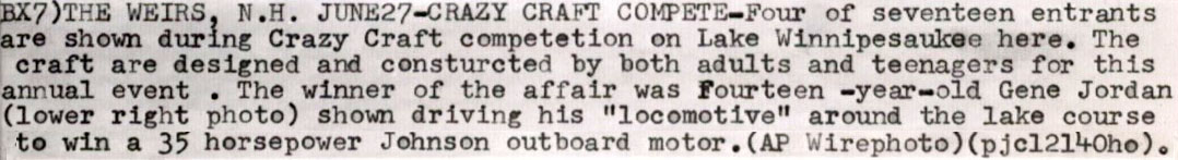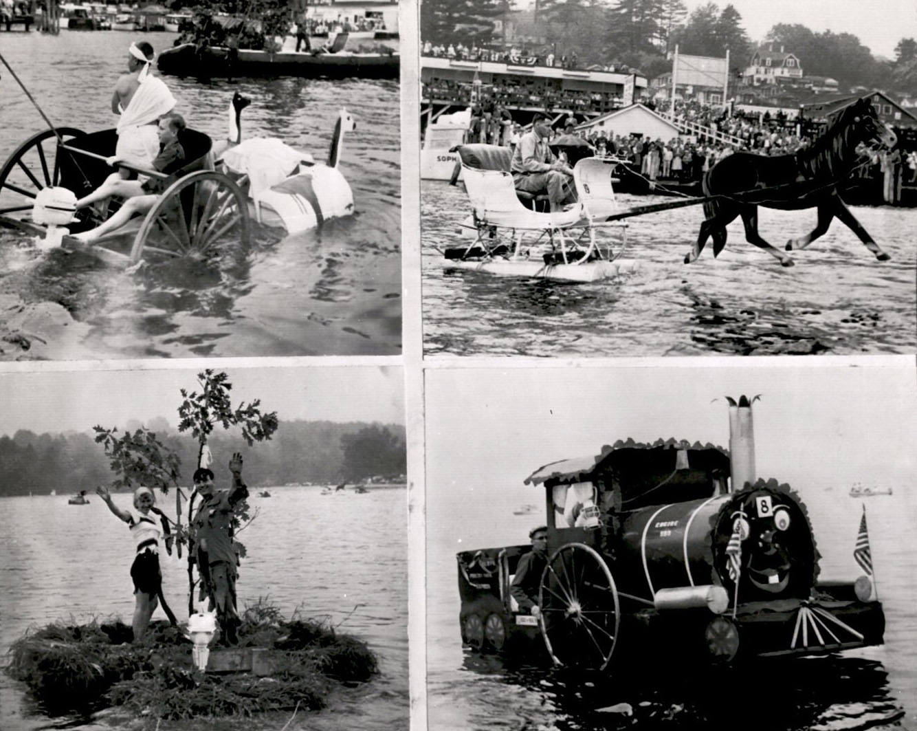 Photos from the “Crazy Craft” competition, part of the 1959 Boat-O-Rama event. The unique, floating craft were propelled by outboard motors, and included a two-horse wagon, a one-horse sleigh, a castaway island, and a steam locomotive.