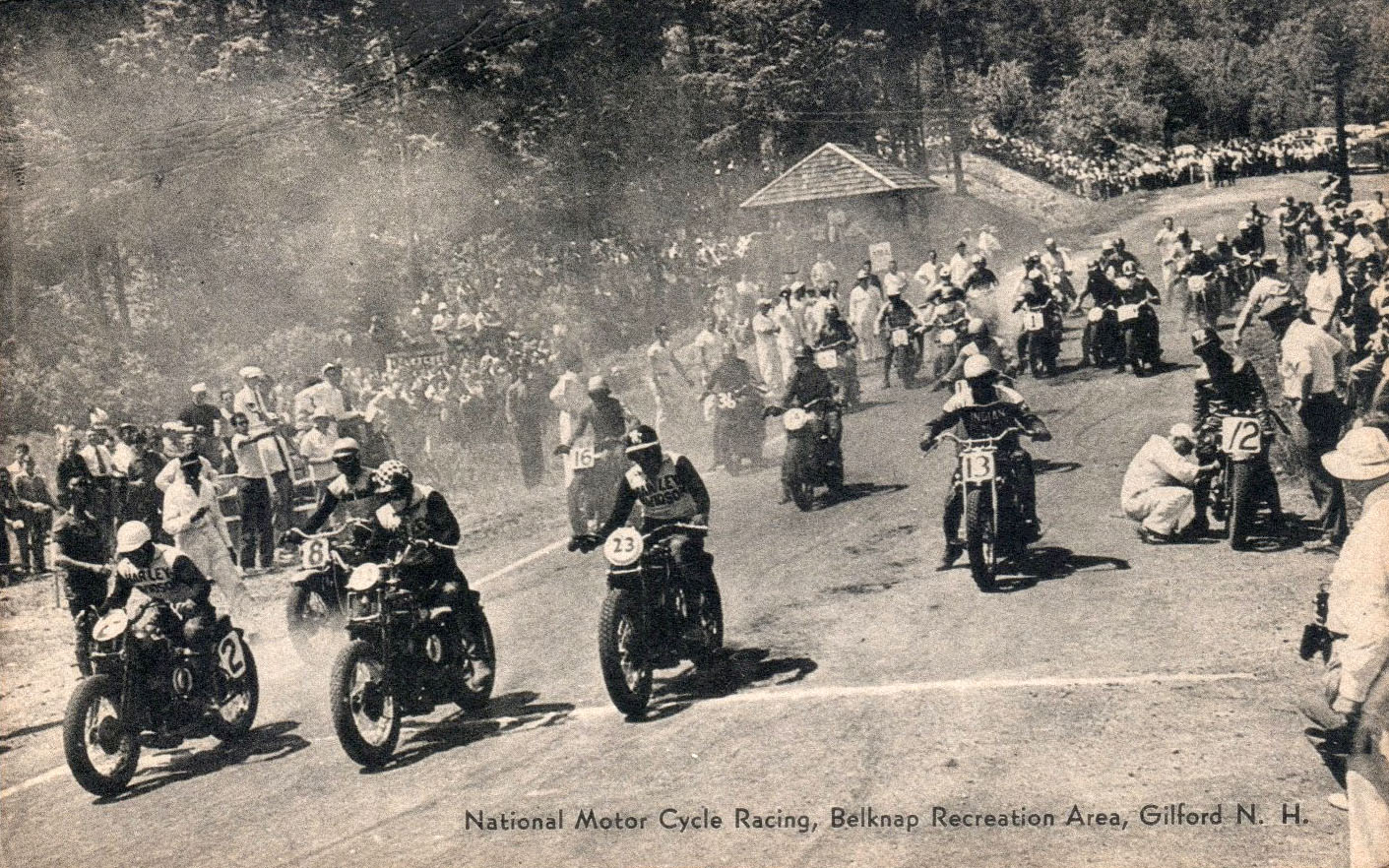 Motorcycle racing at the Belknap Mountain Recreation area in the 1950s. During the 50s, the resort rivaled Weirs Beach as a center of Motorcycle Week activity, with the races being a huge draw.