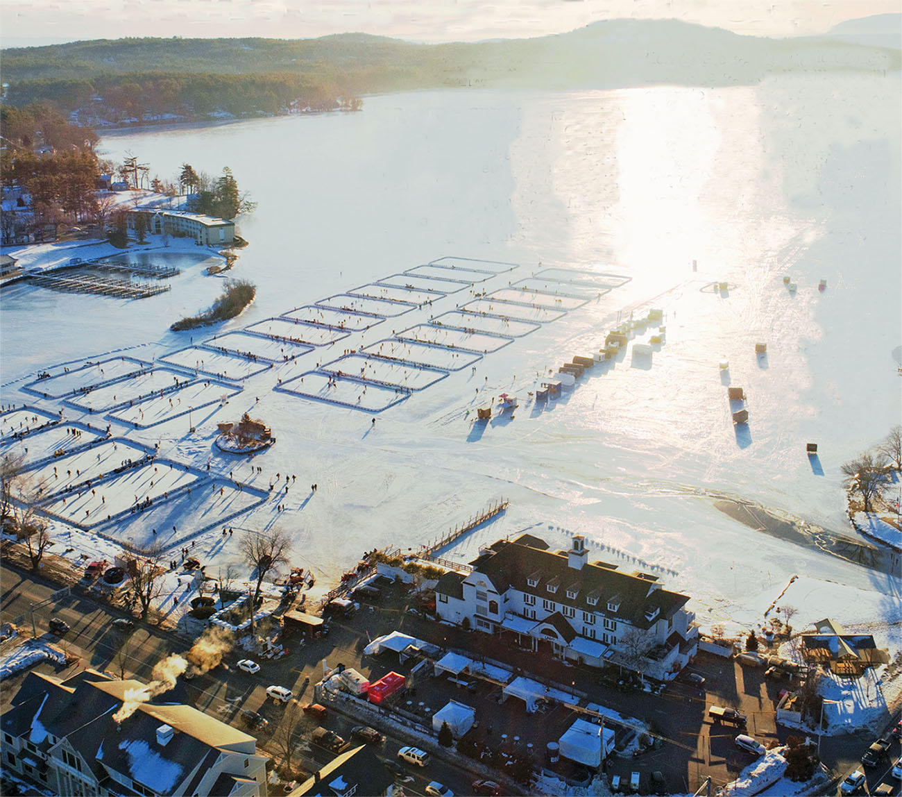 Fortunately, the fishing and hockey events both have alternatives in years of thin ice. The fishing derby is a statewide event, so even if there is thin ice on Lake Winnipesaukee, there will be many small lakes and ponds nearby with ice thick enough for fishing. And the hockey event has had an alternate location in Meredith, Lake Waukewan, that has been a reliable backup when Lake Winnipesaukee ice has been too thin.