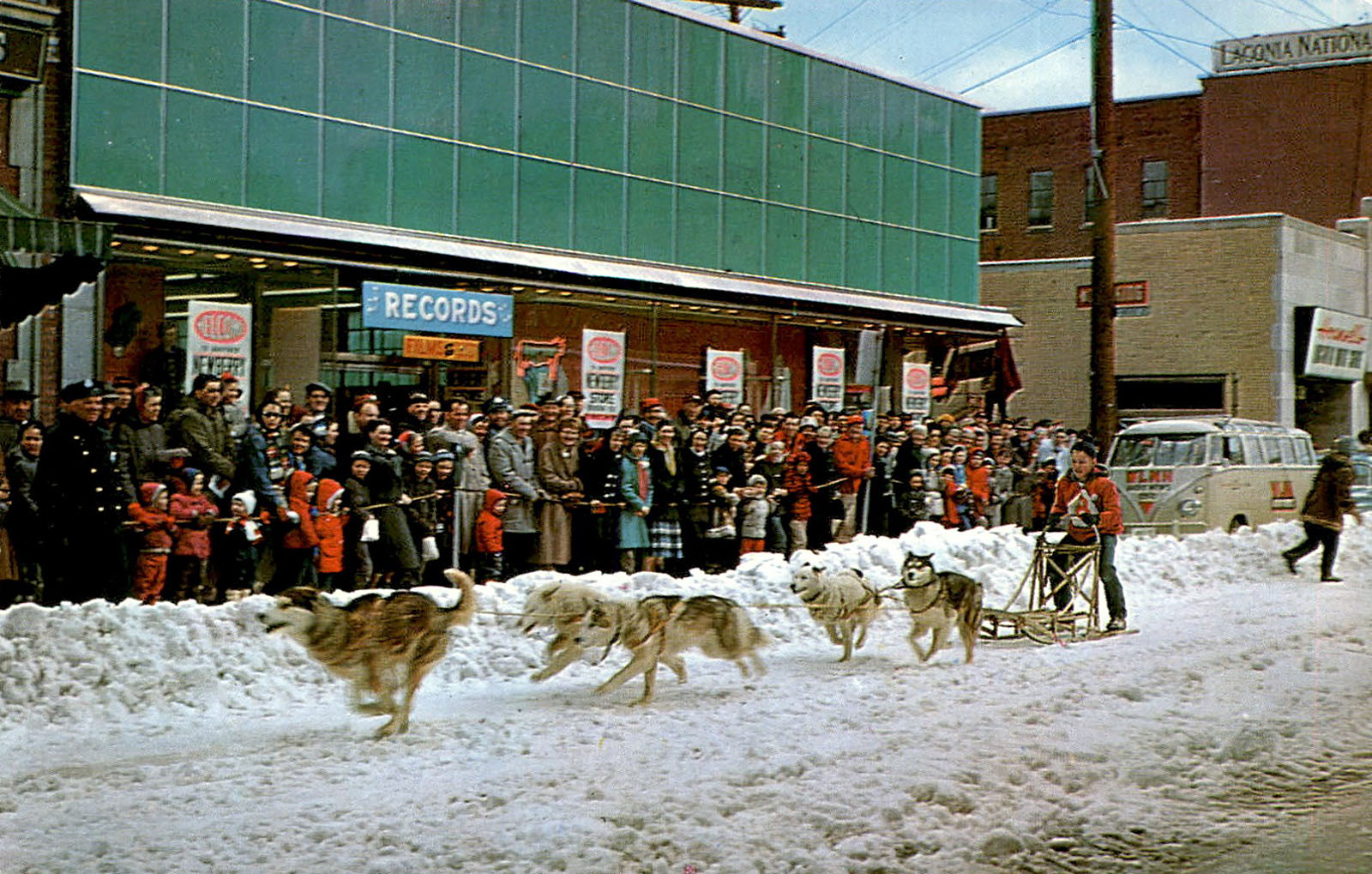 Sled dog racing down Laconia’s Main Street in the 1960’s (color photos) and in the 1930’s (black and white photos). Due to climate change, there is no longer enough snow to cover downtown’s Main Street, where the race originally started and ended. The race now starts and ends in a field off of North Main Street, between the Ahearn State Park entrance and Lake Opechee.
