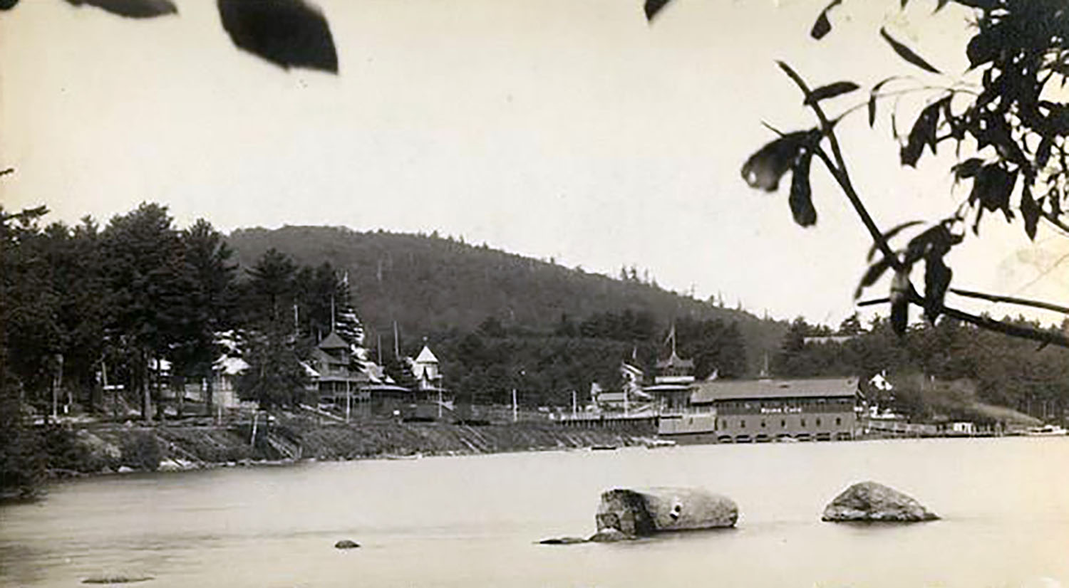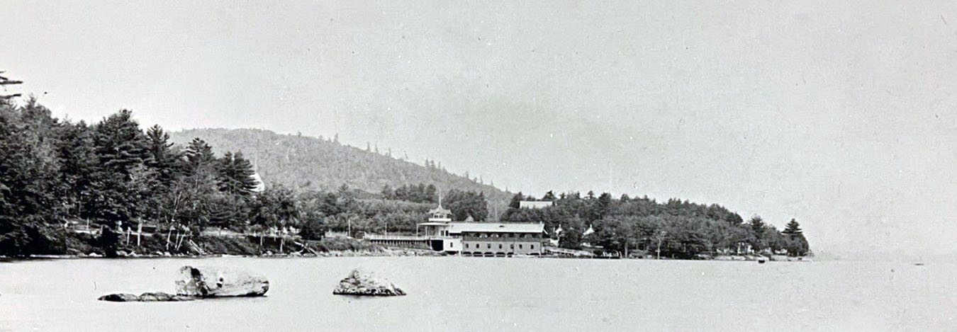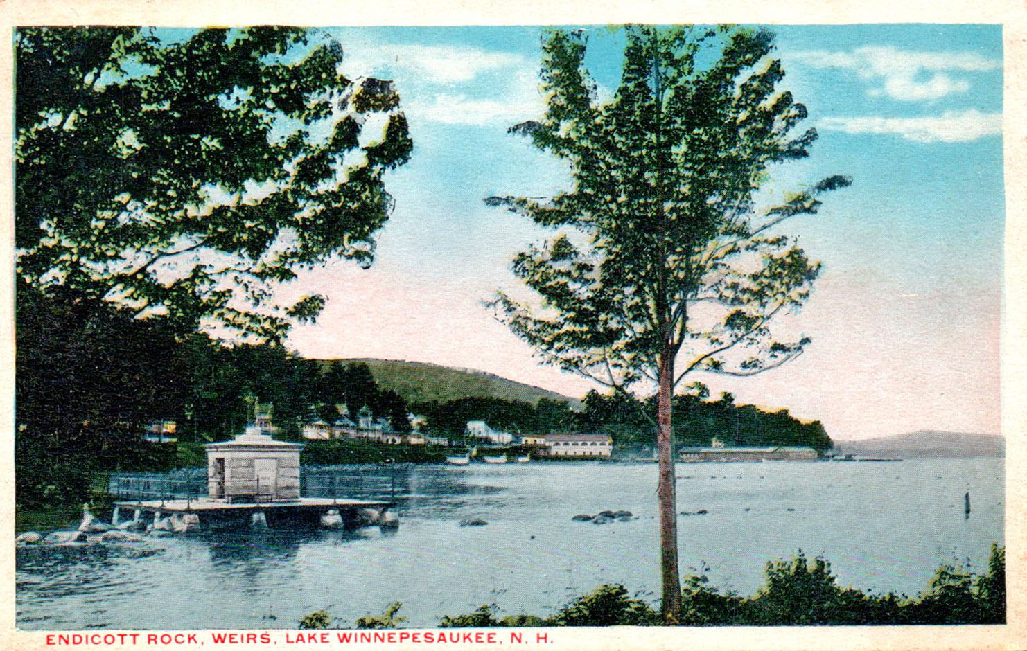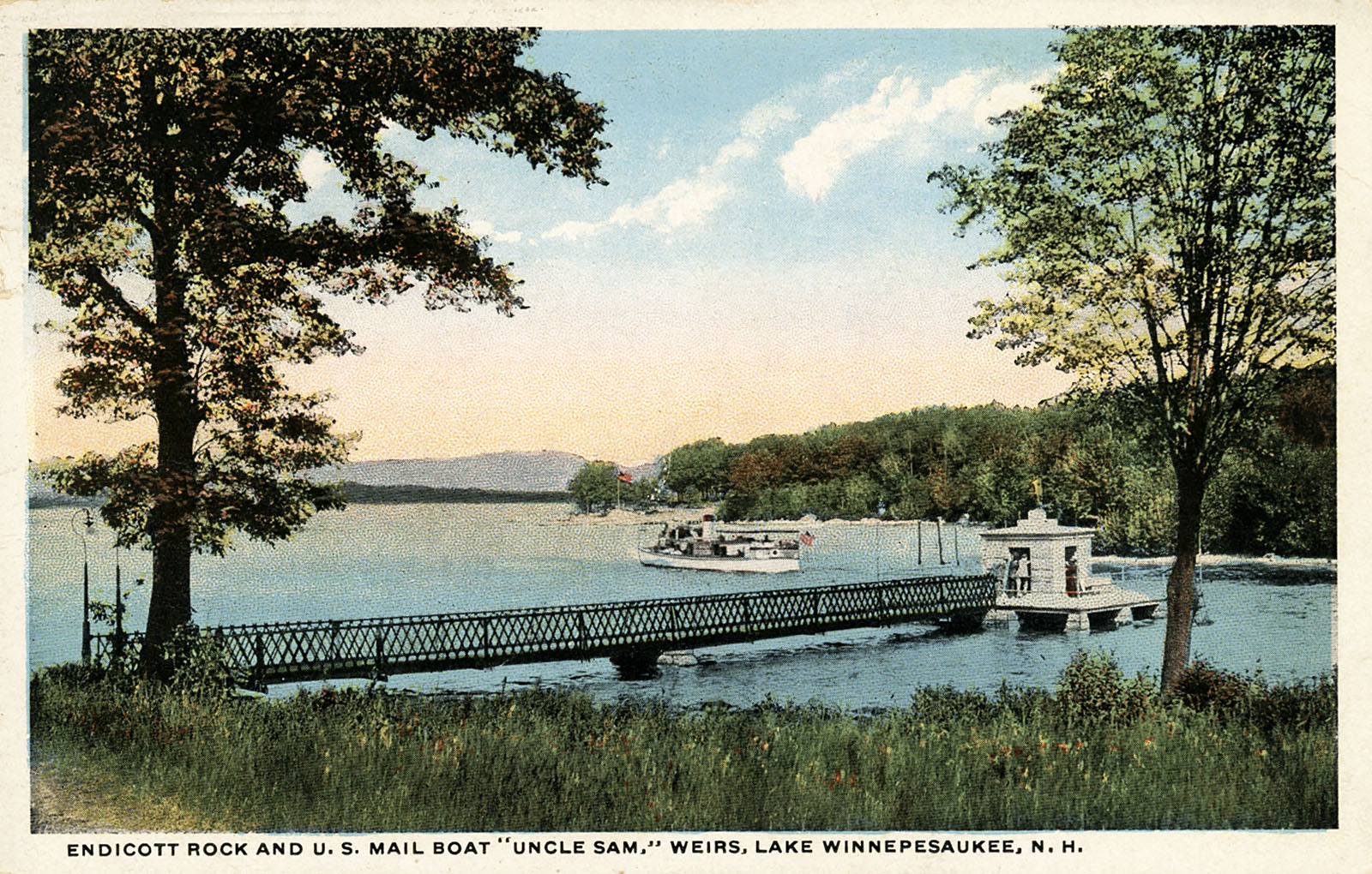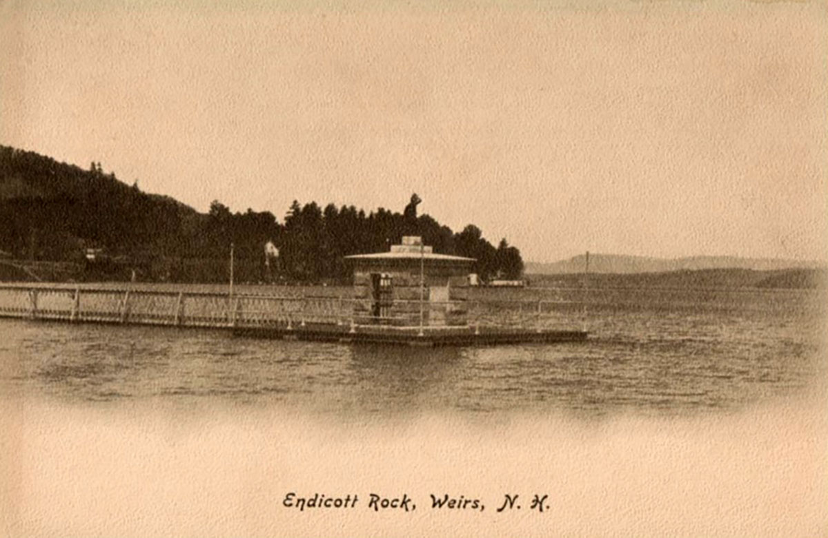 Below is the oldest known photo of Endicott Rock. It is from a stereoview by W.L. Wilder, whose photos of the Weirs Channel are also the oldest on this website. The Rock is the flattish, second boulder from the right. The large boulder on the right was eventually removed, but not until years after the monument was built. In the photos below showing the wooden footbridge, the large boulder is seen clearly sitting outside the monument.