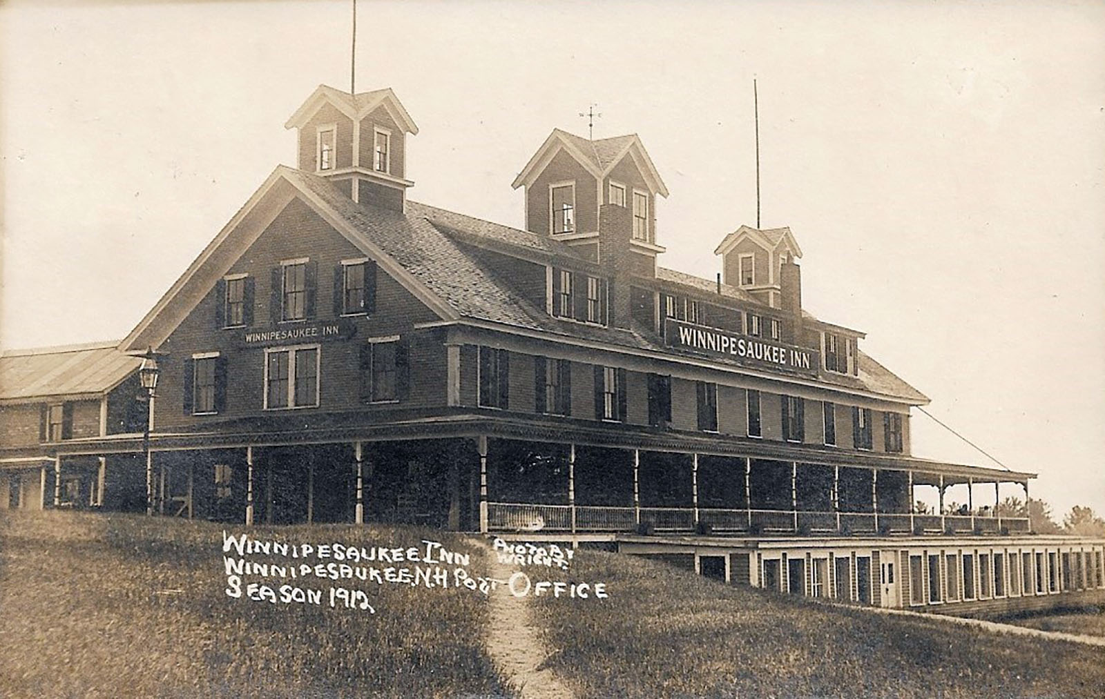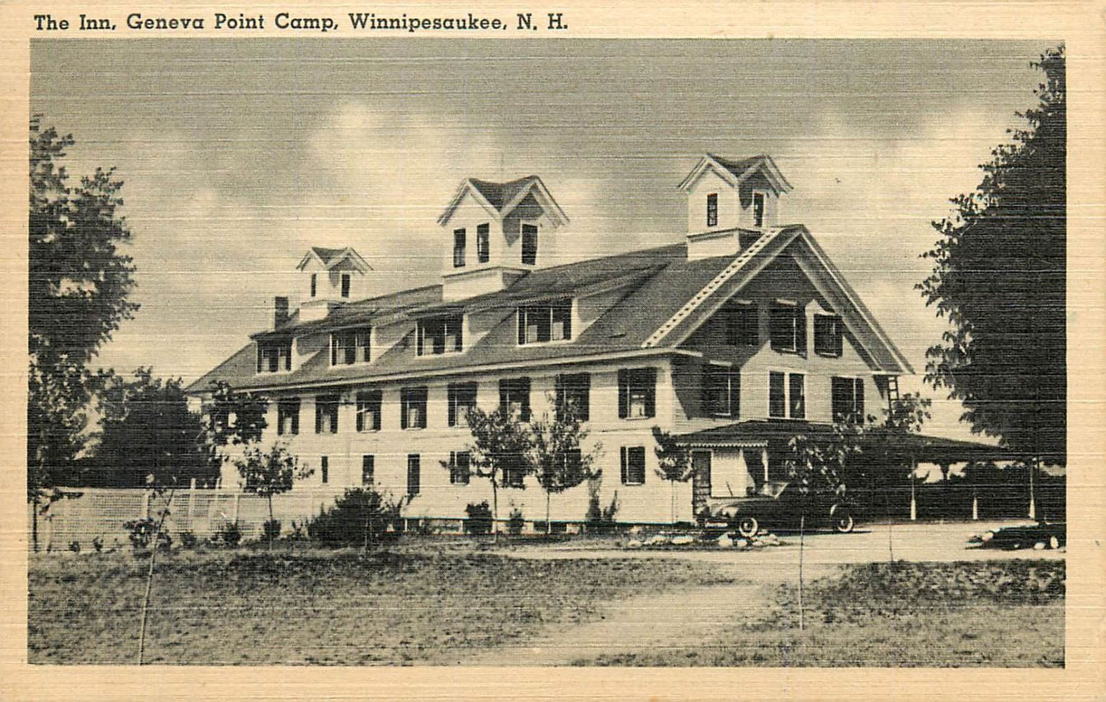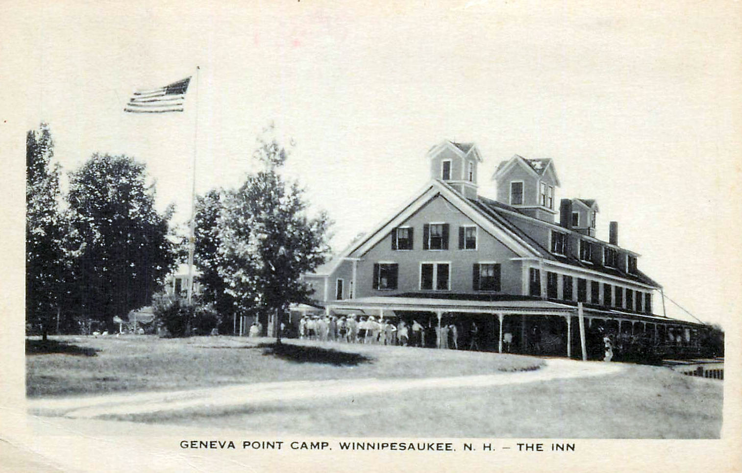 Besides Dr. Greene’s ownership of the New Hotel Weirs, Greeene’s ownership of the Roxmont Poultry Farm on Long Island was his other principal land holding. Below are selected pages of a brochure from the farm. For more about the Roxmont Poultry Farm, click here. The farm operated from 1889-1896. In 1907, Dr. Greene converted the former farm property to the Winnipesaukee Inn. The Inn featured a billiard hall, bowling alley, golf course, sandy beach, boat house, tennis courts, livery, guide service, and a U.S. post office. In 1919, the Inn was sold, and became the Geneva Point Center. Scroll down for photos of the Winnipesaukee Inn. Greene’s Roxmont Castle residence burned in 1932.
