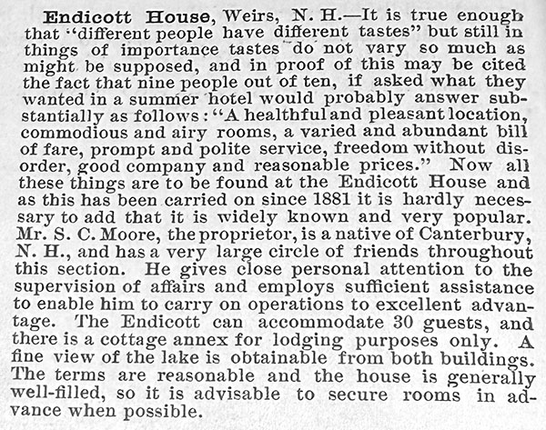 The Endicott House was built in 1881. It was located where the upper parking lot of the Boardwalk Bar & Grill (previously the Weirs Beach Waterslide) is today. It burned down or was taken down in the late 1930s.