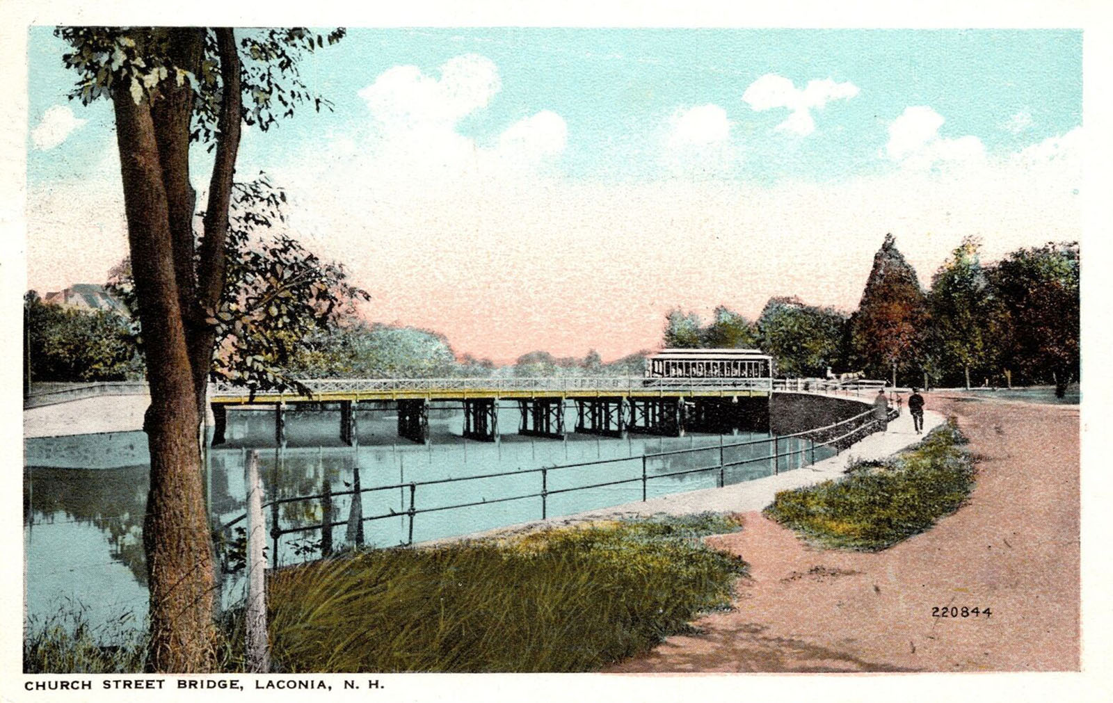 Below is a gallery of historic postcards documenting the journey by trolley car from downtown Laconia to Weirs Beach. The journey starts at the South End of Main Street, travels up Main Street to Bank Square, left on Pleasant Street, right at Veterans Square, down Church Street, across the Church Street wooden trestle bridge*, to Normandin Square, and along Union Avenue to Lakeport Square. There is then a gap in the postcards. Not shown is the journey along Weirs Boulevard, where there was a stop and a siding in Langley Cove. The postcard journey resumes when we reach the steel bridge across the Weirs Channel, and finally arrive at journey’s end in Weirs Beach.