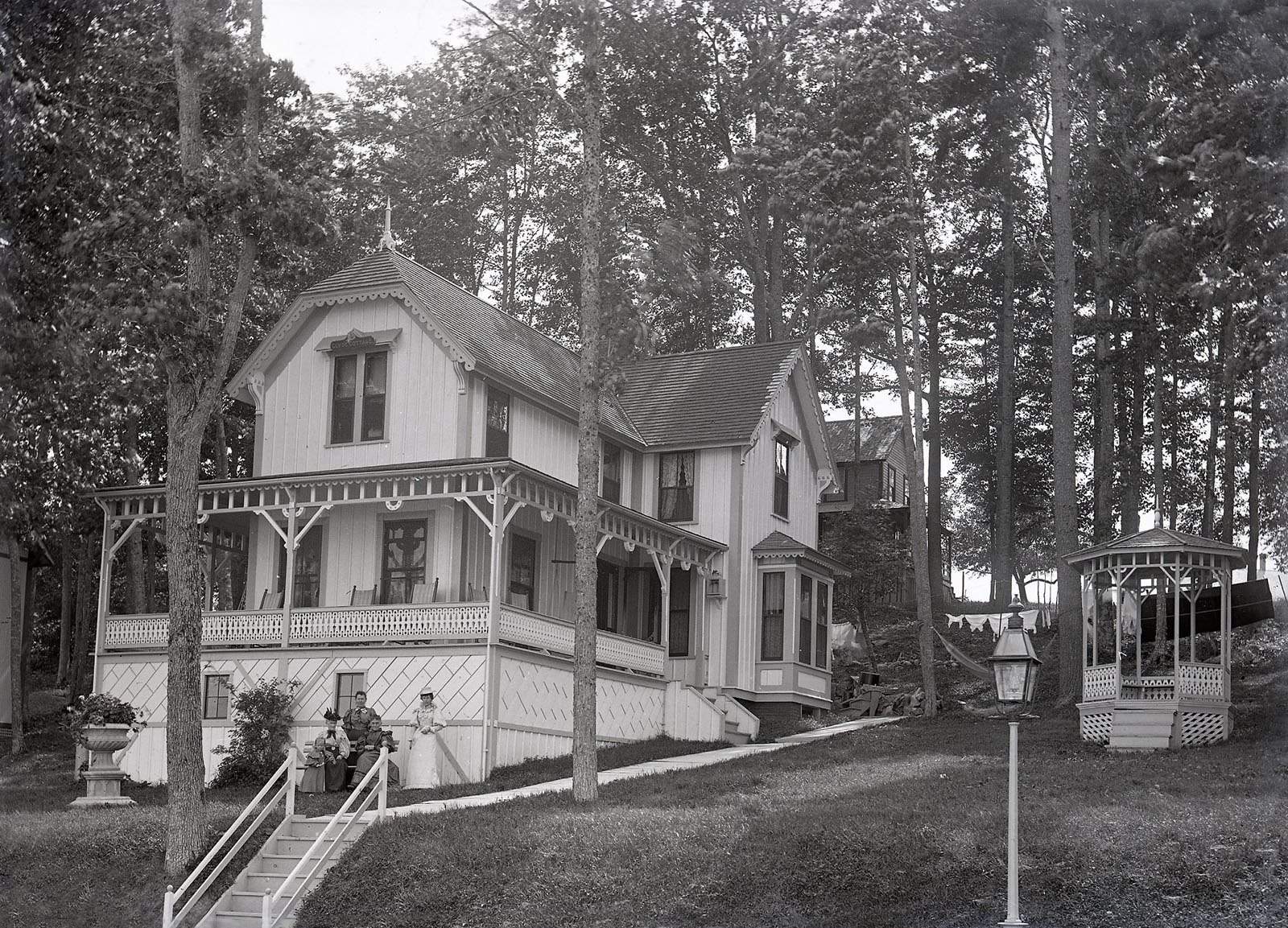 A photo of Clyde House from the Oren W. Hills collection. During the 1890s, when this photo was taken, Clyde House was known as Clyde Cottage. A small sign with that name is hanging over the 2nd floor window. Sometime after this photo, the house was expanded on its left side. The house behind Clyde House no longer exists, nor does the lawn and gazebo on its right side. To the right of Clyde House is now a parking lot. Clyde House is now a rooming house for foreign student employees of the Half Moon Enterprises.