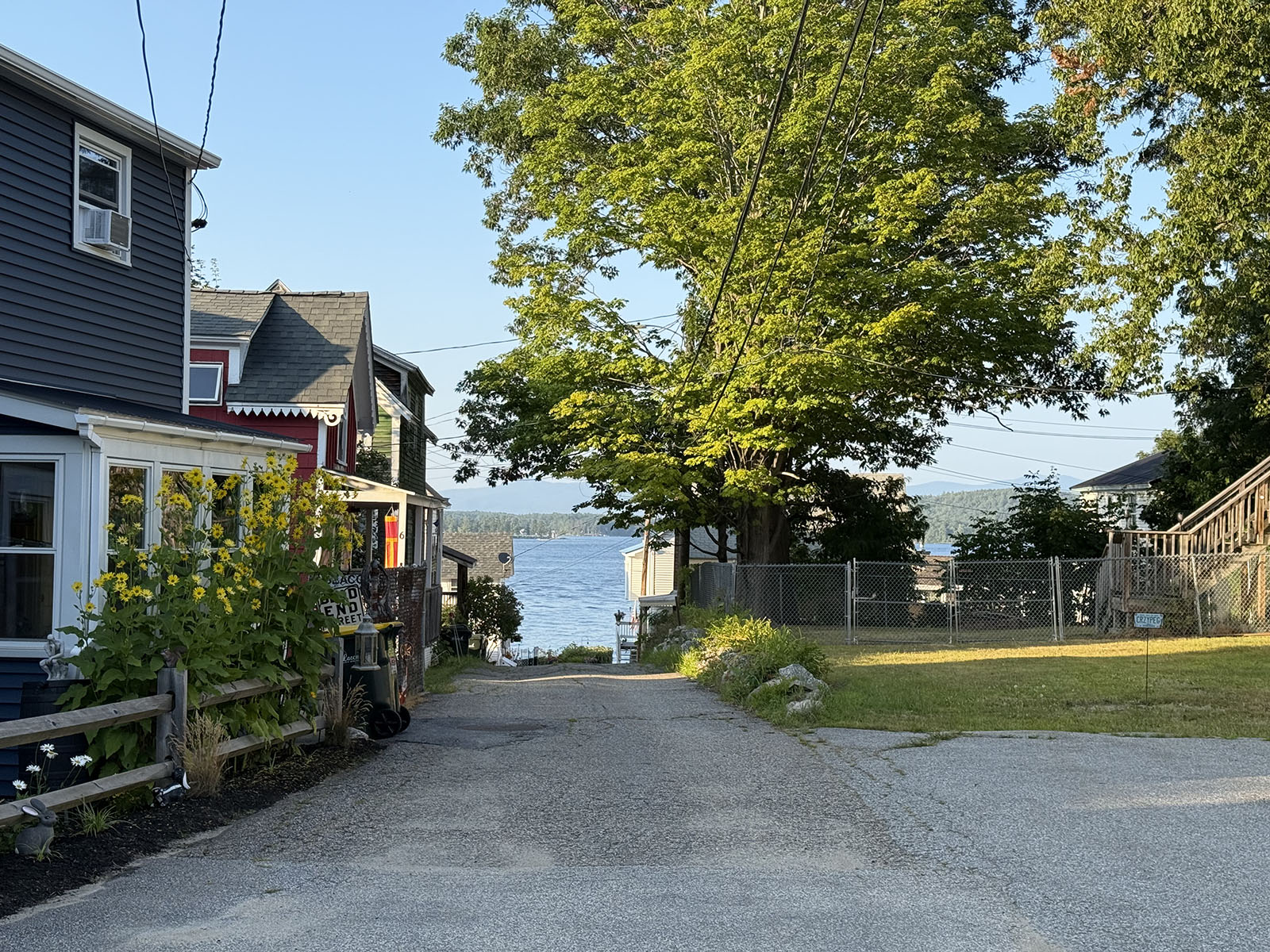 Gallery of Methodist Campground cottages. Photo #1 is a view north on Centenary Ave. The faint outline of Brickyard Mountain can be seen in the distance. Photo #2 is also of Centenary Ave, looking in the opposite direction. Note the lack of electrical utility poles. Electrical service did not arrive in Weirs Beach until 1884, so the photo dates before then. Photo #3 is the entrance to Morris Avenue. An arc sign has lettering for the Chateau de Lis, a tiny bit of whose roof can be seen in the photo. See below for a contemporary photo of Morris Avenue. Photo #4’s location in the campground is unknown.