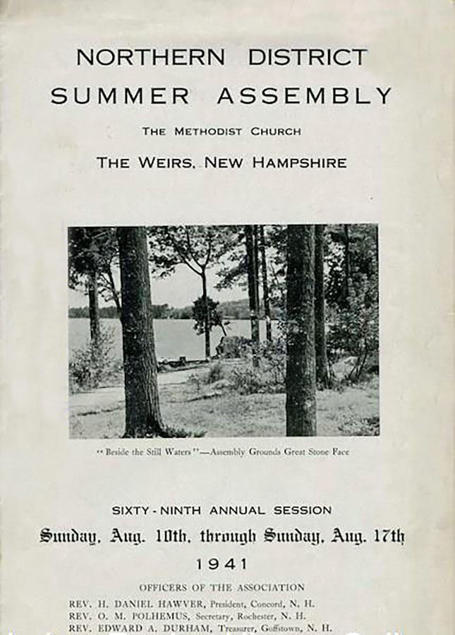 A 1941 circular for the 69th annual summer meeting of the Methodists. This indicates that the first meeting took place in 1873. The “Great Stone Face” in the photo was also known as Profile Rock, many more images of which can be found on the Shore Path webpage on this website.
