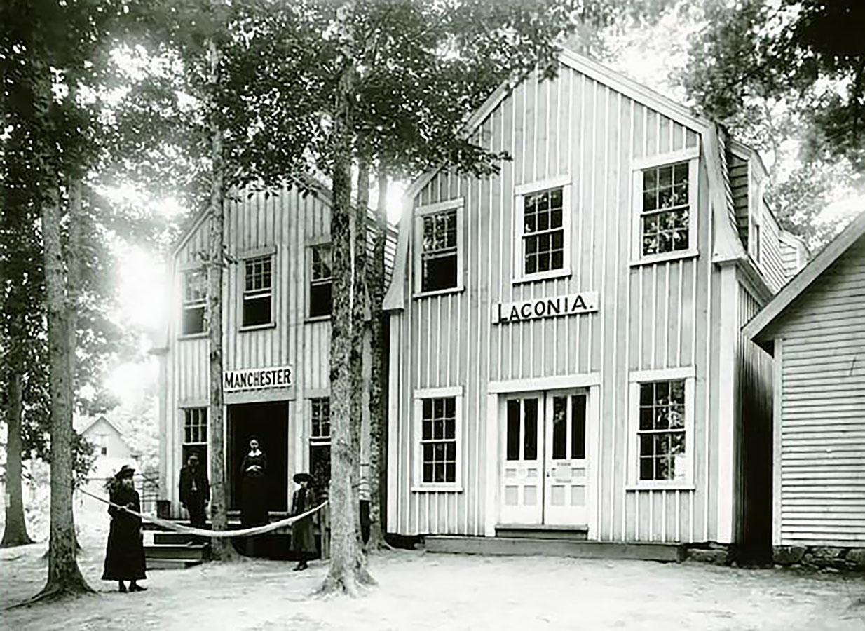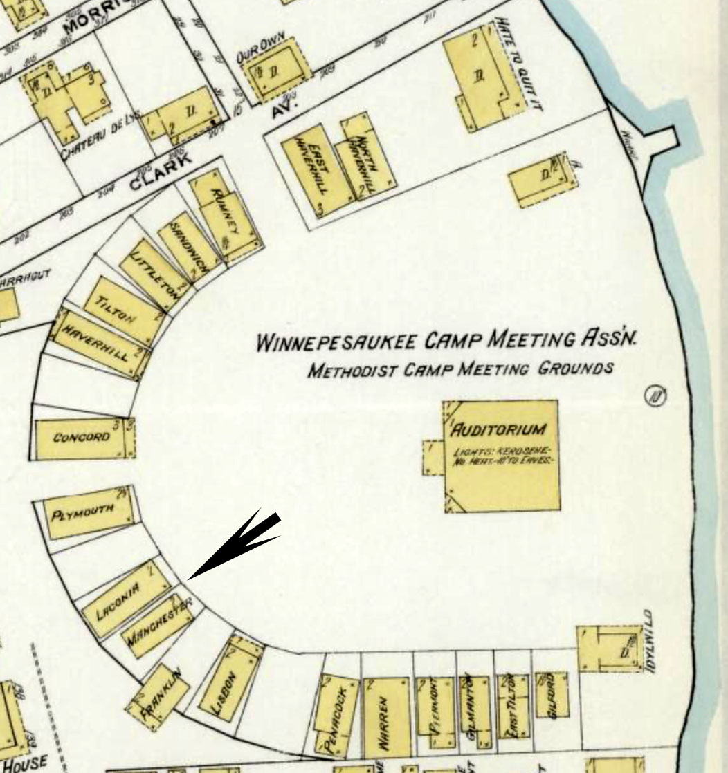 The Laconia and Manchester houses, as indicated by the arrow on the Sanborn map. There were many other NH towns with their own houses. The towns on the map, in a clockwise direction, were Gilford, East Tilton, Gilmanton, Piermont, Warren, Penacook, Lisbon, Franklin, Manchester, Laconia, Plymouth, Concord, Haverhill, Tilton, Littleton, Sandwich, Rumney, East Haverhill, and North Haverhill.
