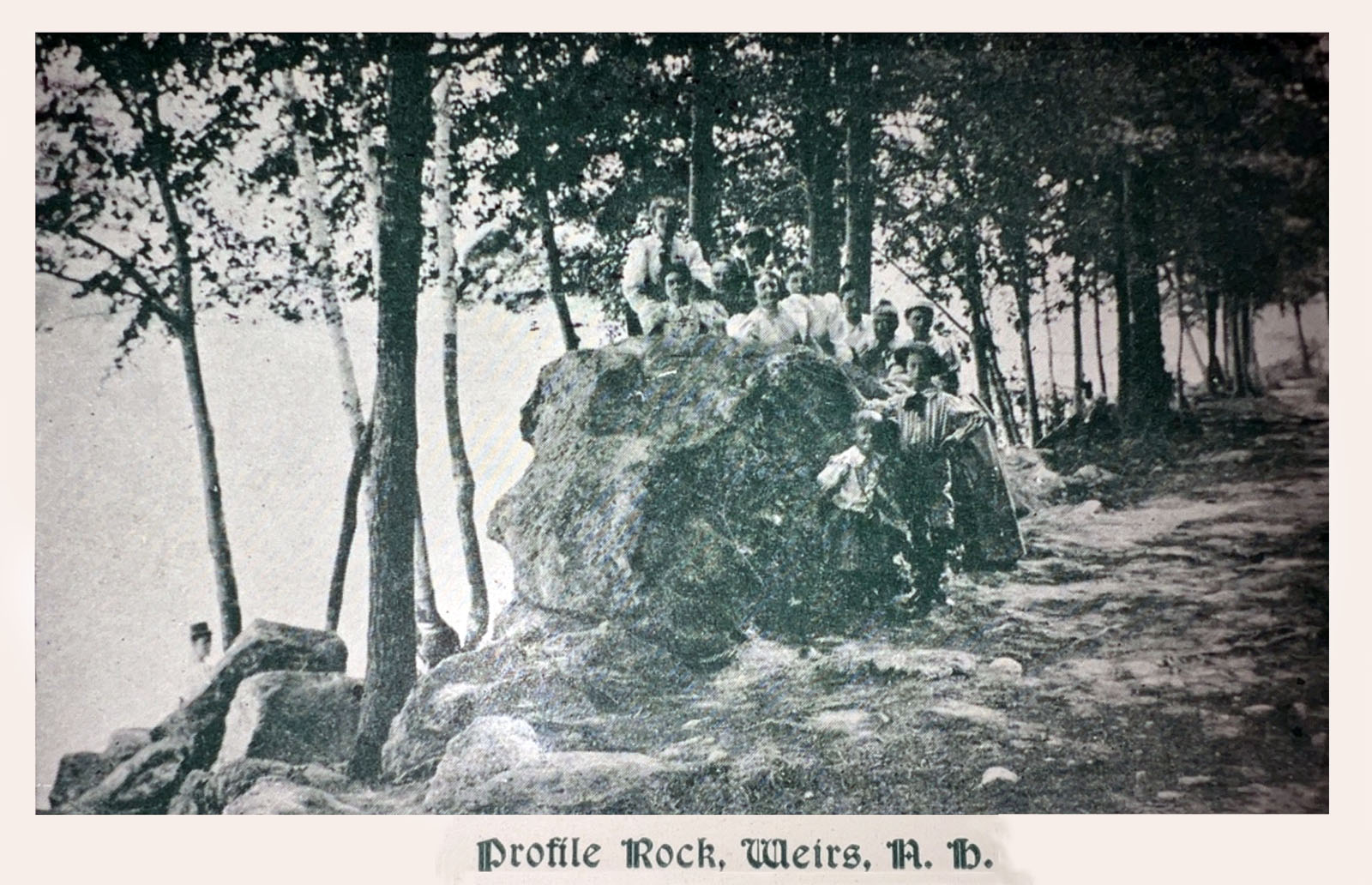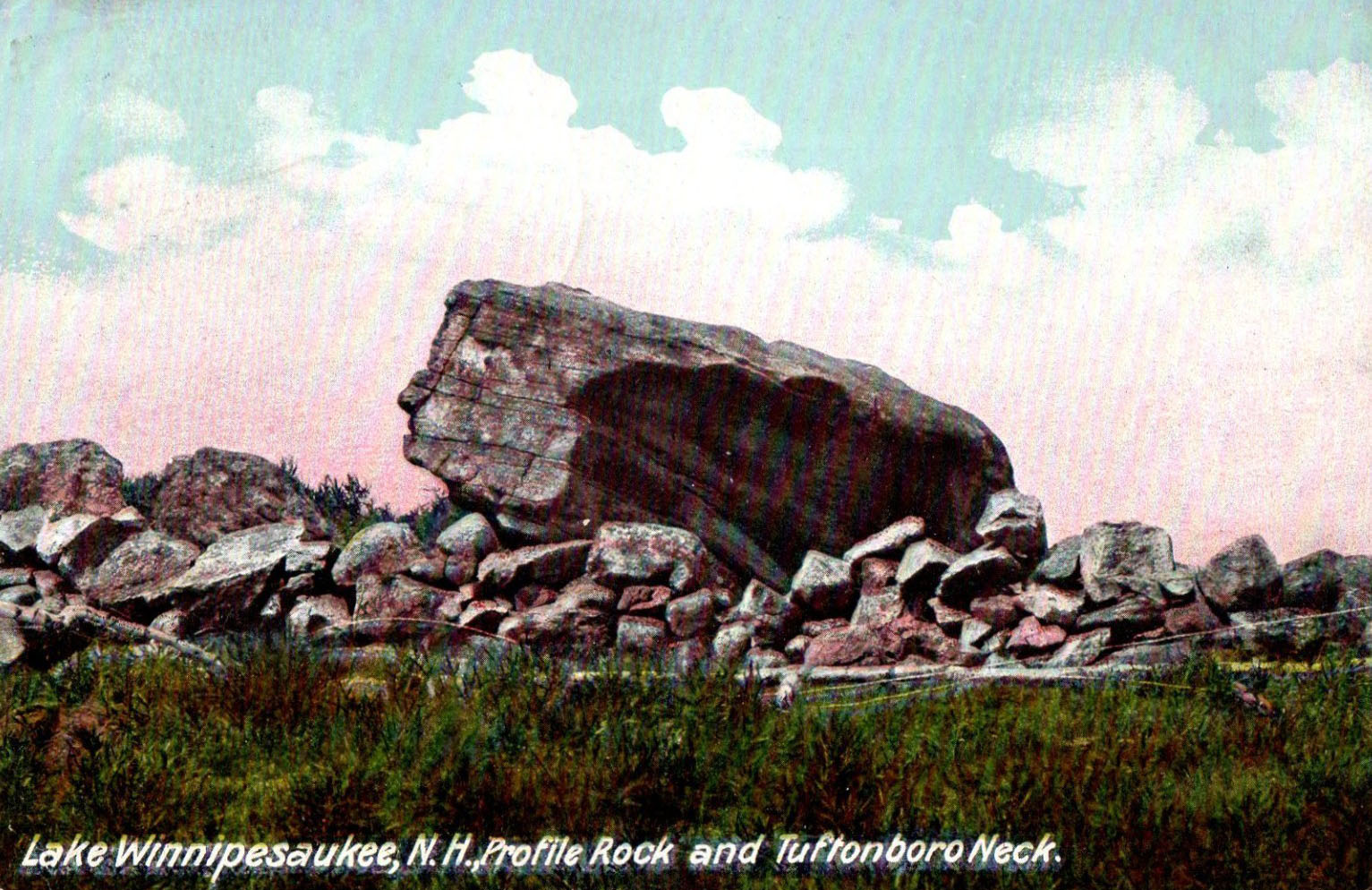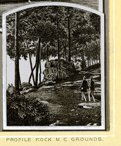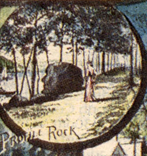 Walkers heading south along the shore path encountered an unusual rock that resembled an old man. The rock was first dubbed “Profile Rock” in the 1880s. Later, the rock was glorified in a couple of old postcards as “The Old Man of Winnipesaukee”, taking a cue from New Hampshire’s state emblem, the former Old Man of the Mountain, which crumbled down Cannon Mountain in Franconia Notch in 2003. Unlike the Old Man of the Mountain, Profile Rock is still intact today, sitting right in front of the former auditorium at Methodist Circle.