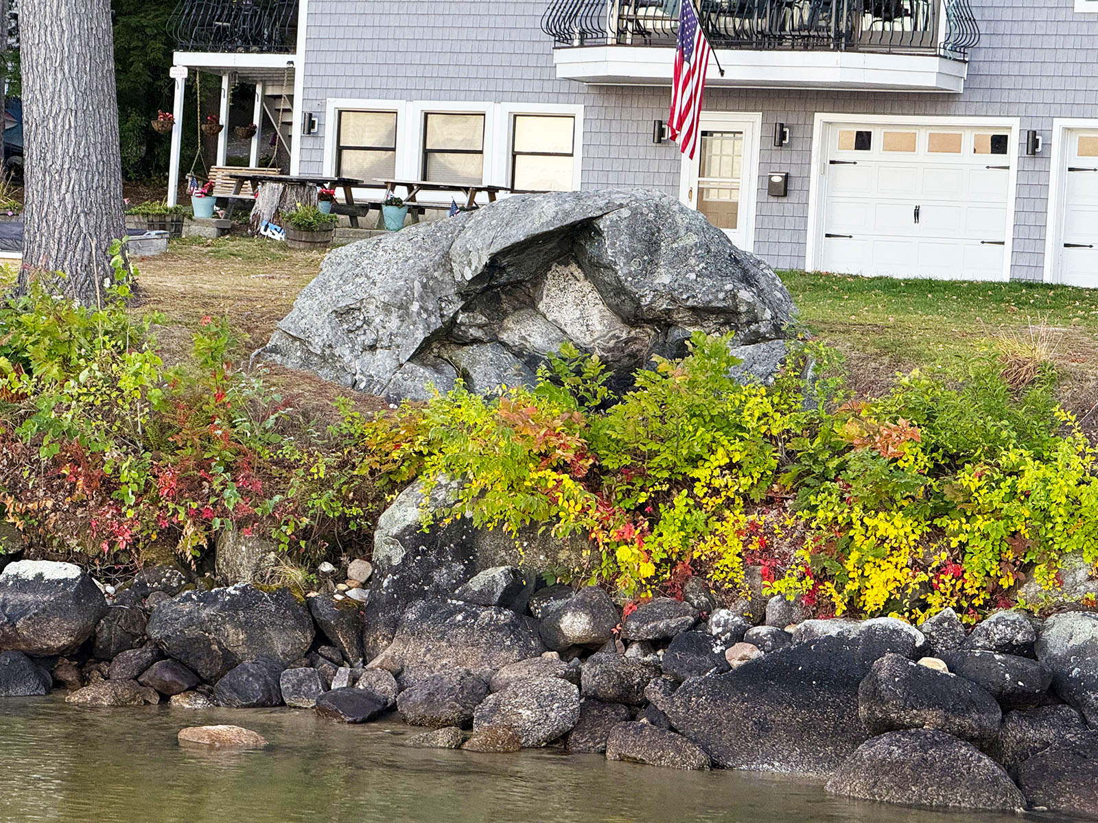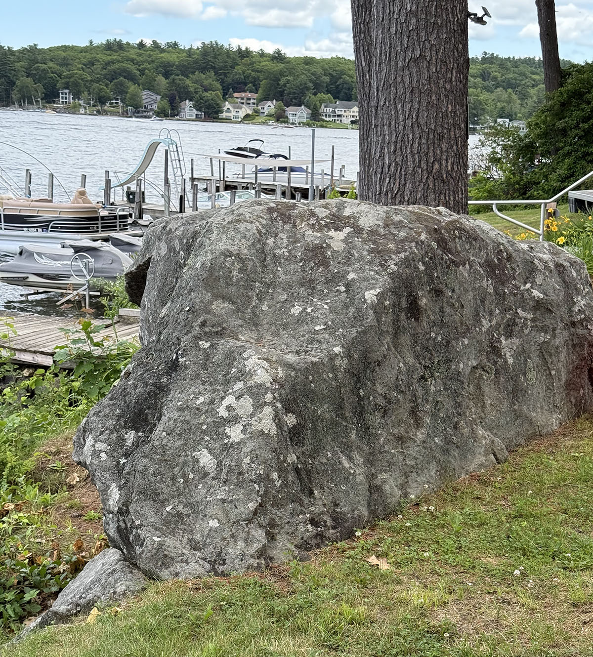 Various postcard views of the Shore Path. The first card called the path the “Sore” Path and mis-spelled the “Wiers”. The card shows a family gathered at their house on the Weirs waterfront, but does not show the actual path. Right behind the family is a large rock, which is also seen in the following two old postcards. This rock still exists, as seen in the contemporary photo below, taken on July 15, 2025. This unnamed rock should not be confused with “Profile Rock”, a more famous rock on the Shore Path (see below).
