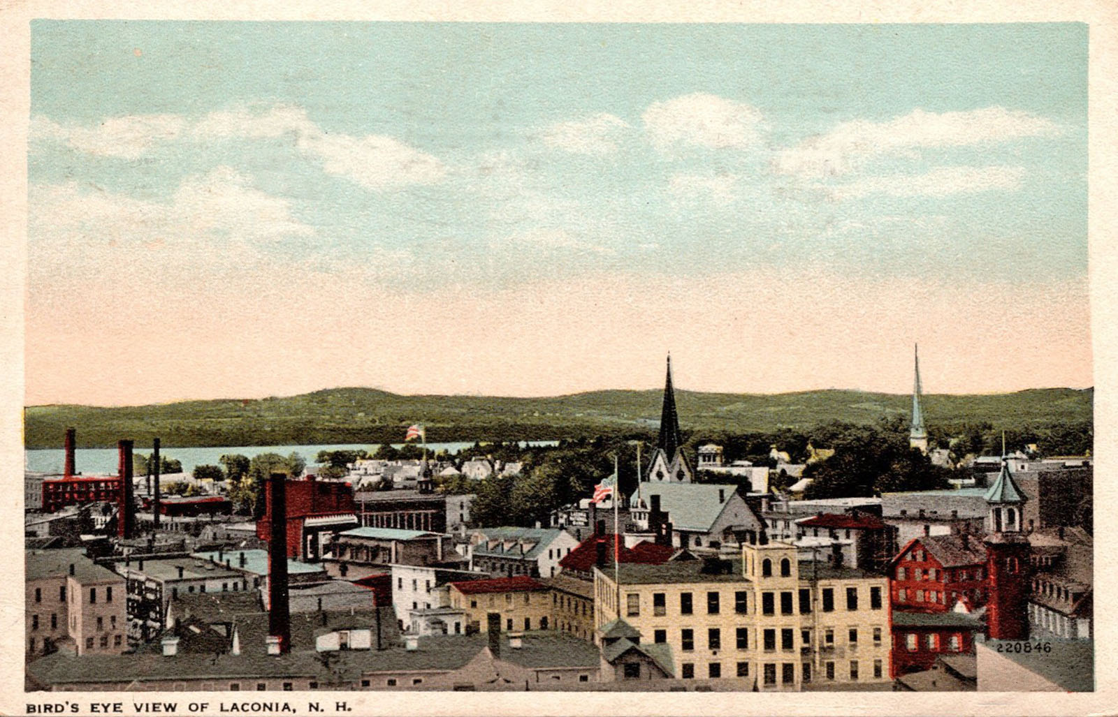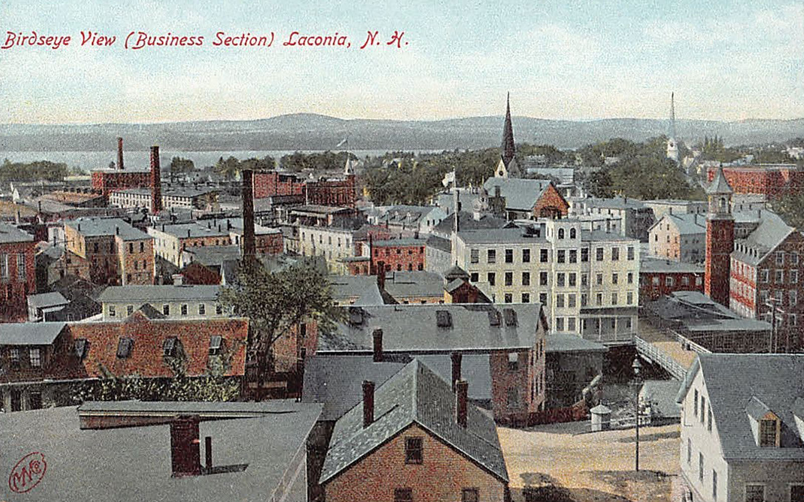 A “Bird’s Eye” view of downtown Laconia from the 1920s shows the Belknap and Busiel mills, the steeples of the Unitarian (left) and the Evangelical Baptist (right) churches, the Moulton Opera House (flying a flag from its cupola), buildings of the Laconia Car Factory, and Lake Winnisquam in the distance.