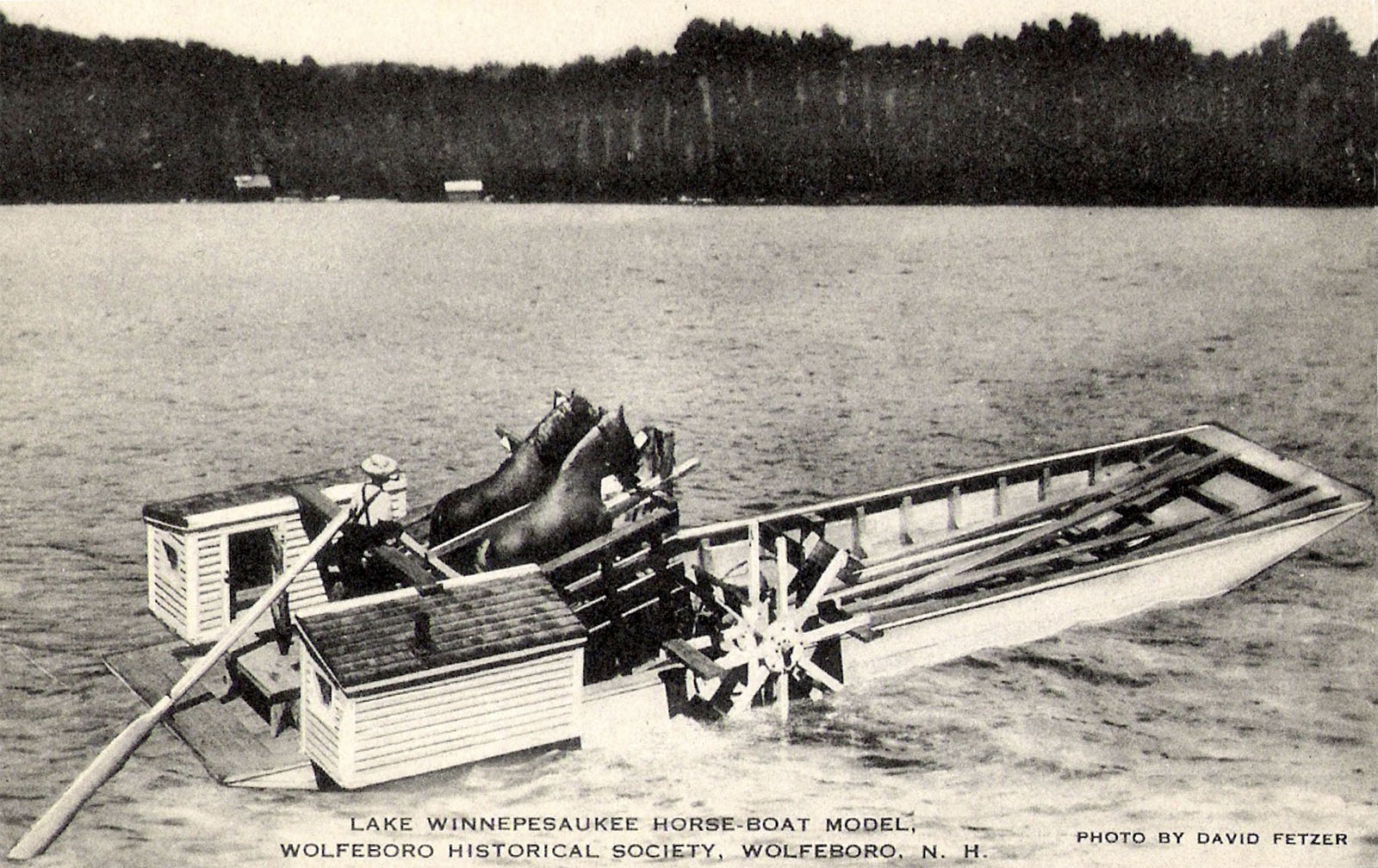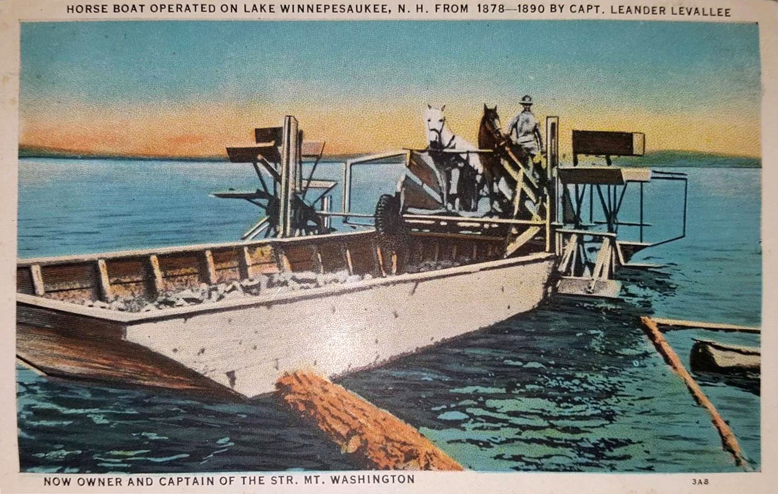 The fuel for the steamships of the era was the abundant, local resource of the day – wood. And the way most of the wood got to the neat piles seen on the wharf in the above photo was by a unique method of freight transportation well-suited to Lake Winnipesaukee – by horseboat. Horseboats were invented in the late 1830s. This was a scow outiftted with an inclined treadmill on which horses walked, driving a side-mounted paddlewheel. Horseboats first towed rafts of logs to sawmills, and then towed the finished cordwood product to the docks of the large, wood-burning steamships that plied the lake. Horseboats survived until the arrival of smaller, more nimble coal-fired steamboats in the late 1800s.