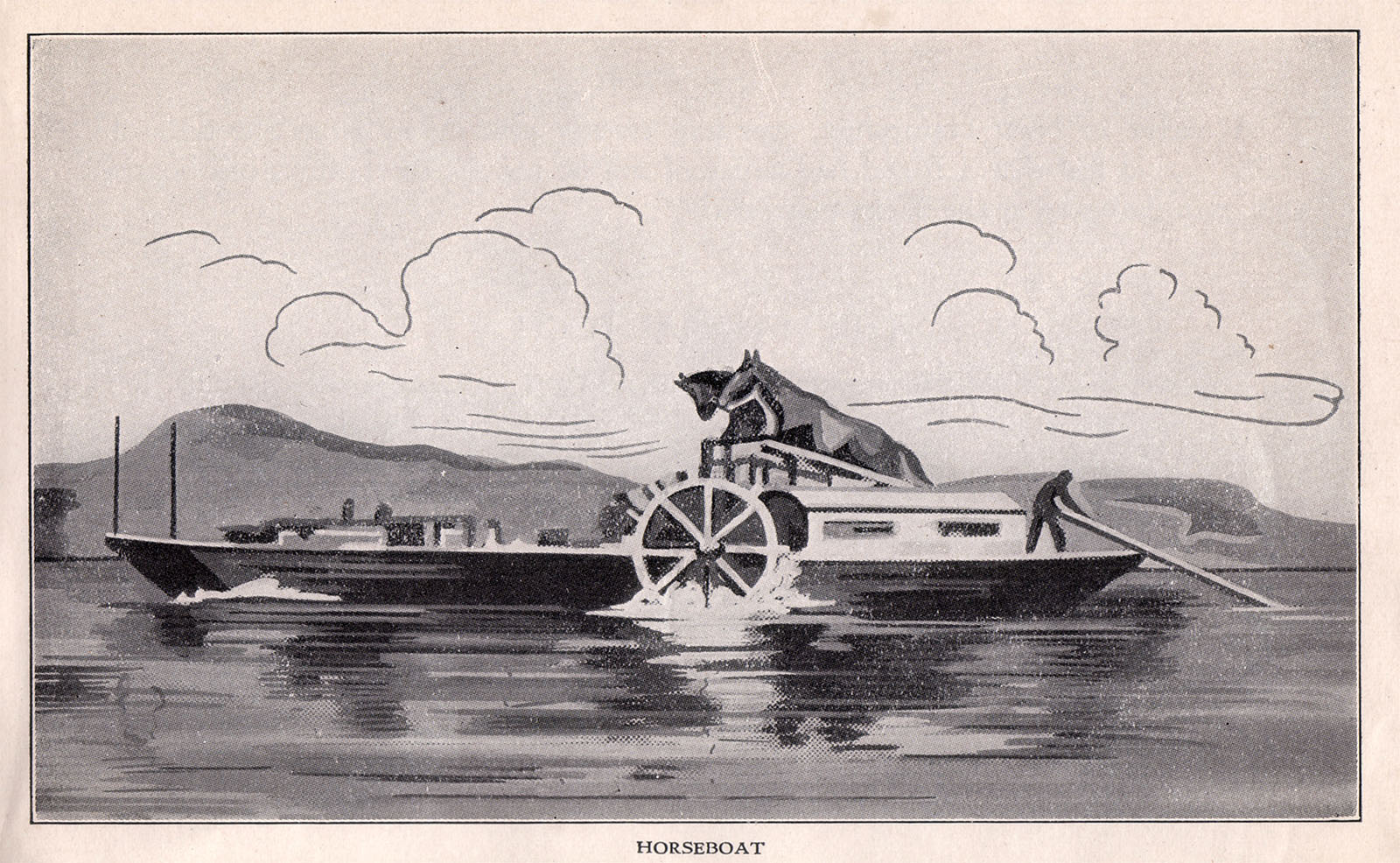 Edgar H. Wilcomb wrote, “Two or three horses furnished the motive power, by means of a treadmill. It was hard work for the horses and they tired very quickly. It is said that in order to spur up the poor jaded beasts, sometimes bags of oats or bundles of hay would be suspended in front of them, on ropes running forward to the flagstaffs at the bow, the oats or hay being gradually moved up nearer the horses as they became more wearied and hungry. Only one captain was necessary on the horseboat. He sat astride the big steering car, behind the horses, and exercised his authority with a whip.”