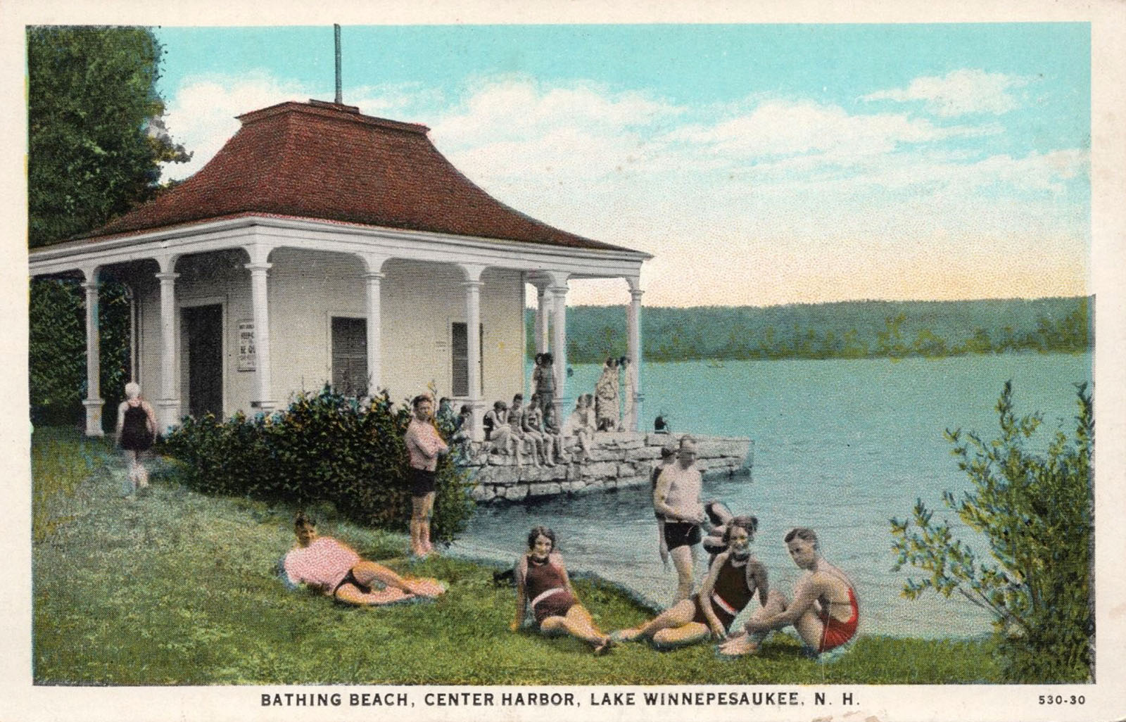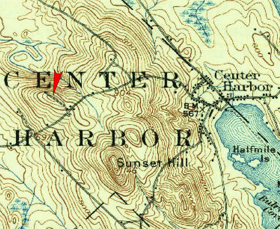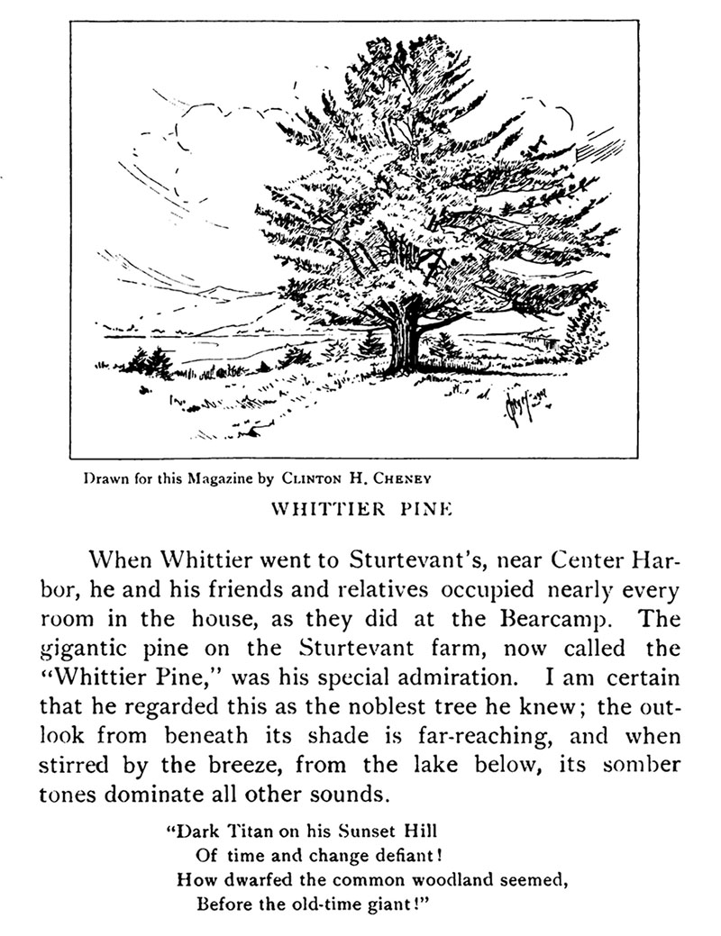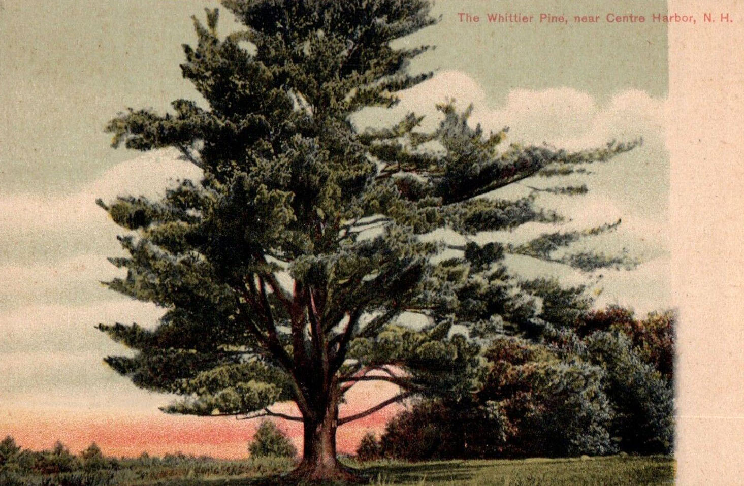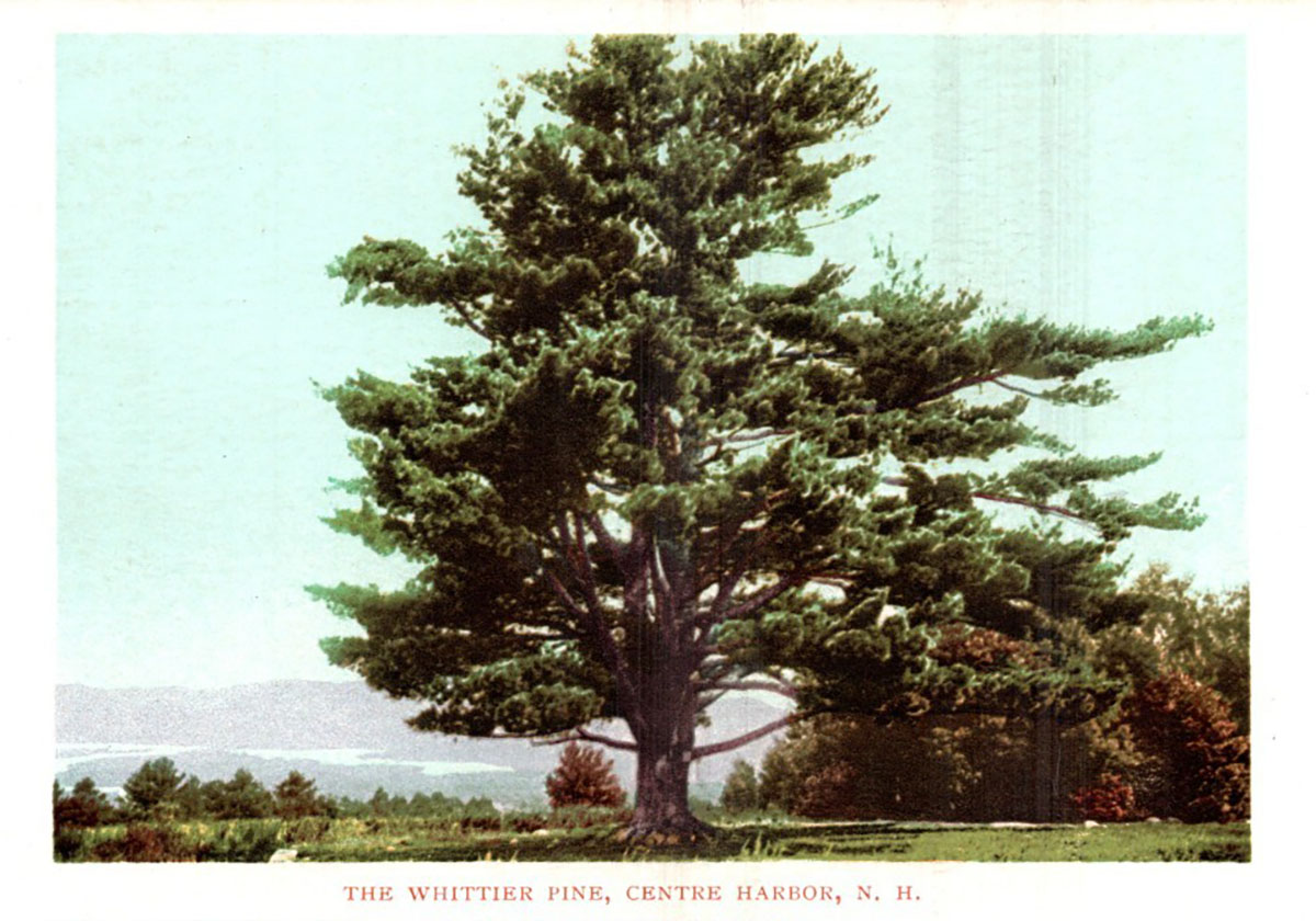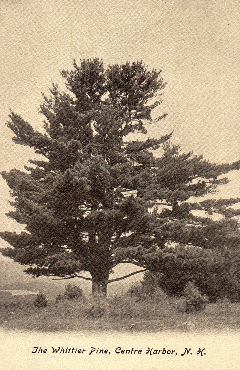 The famed poet of Lake Winnipesaukee, John Greenleaf Whittier, was a frequent visitor to Center Harbor, where he stayed at the Sturtevant farm at the top of Sunset Hill, about a mile and a half from Center Harbor village, on what is now Dane Rd (Route 25B). Greenleaf spent many summers there. The farm had a sweeping view over Squam Lake, which, being to the west of the farm, would also be the direction in which the sun would set. Whittier enjoyed the huge white pine on the farm grounds, which he memorialized in a poem. The tree came to be known as the Whittier Pine, and survived until 1950, when it was struck by lighting. Below are many postcards of the Whittier Pine. A corner of Squam Lake is seen in a couple of the postcards.