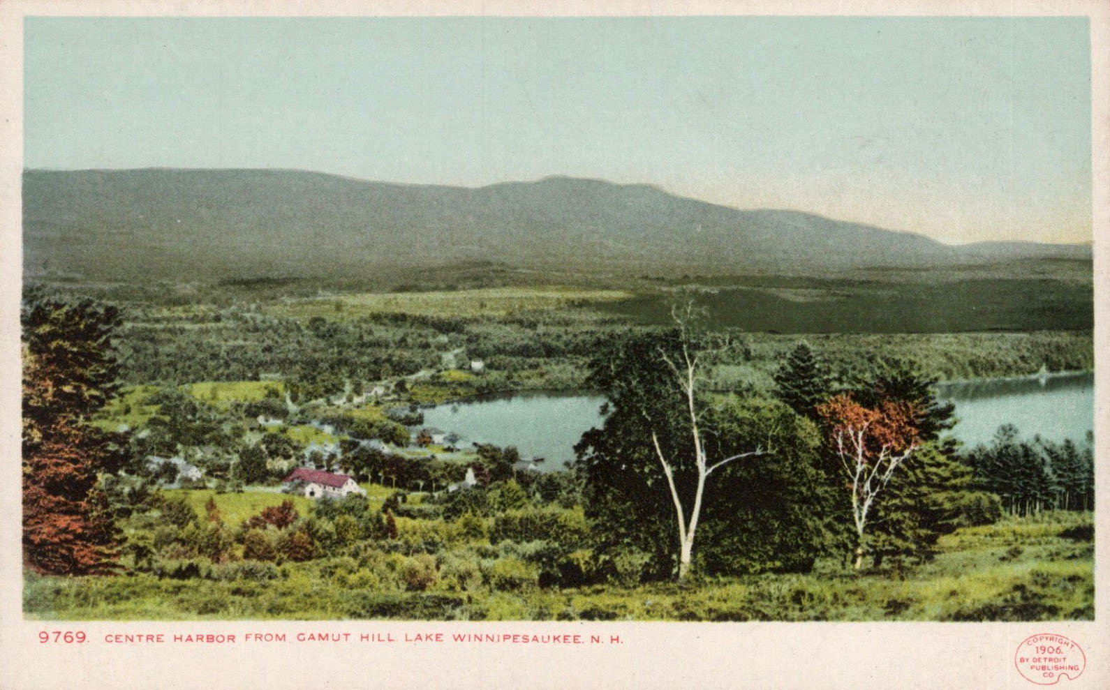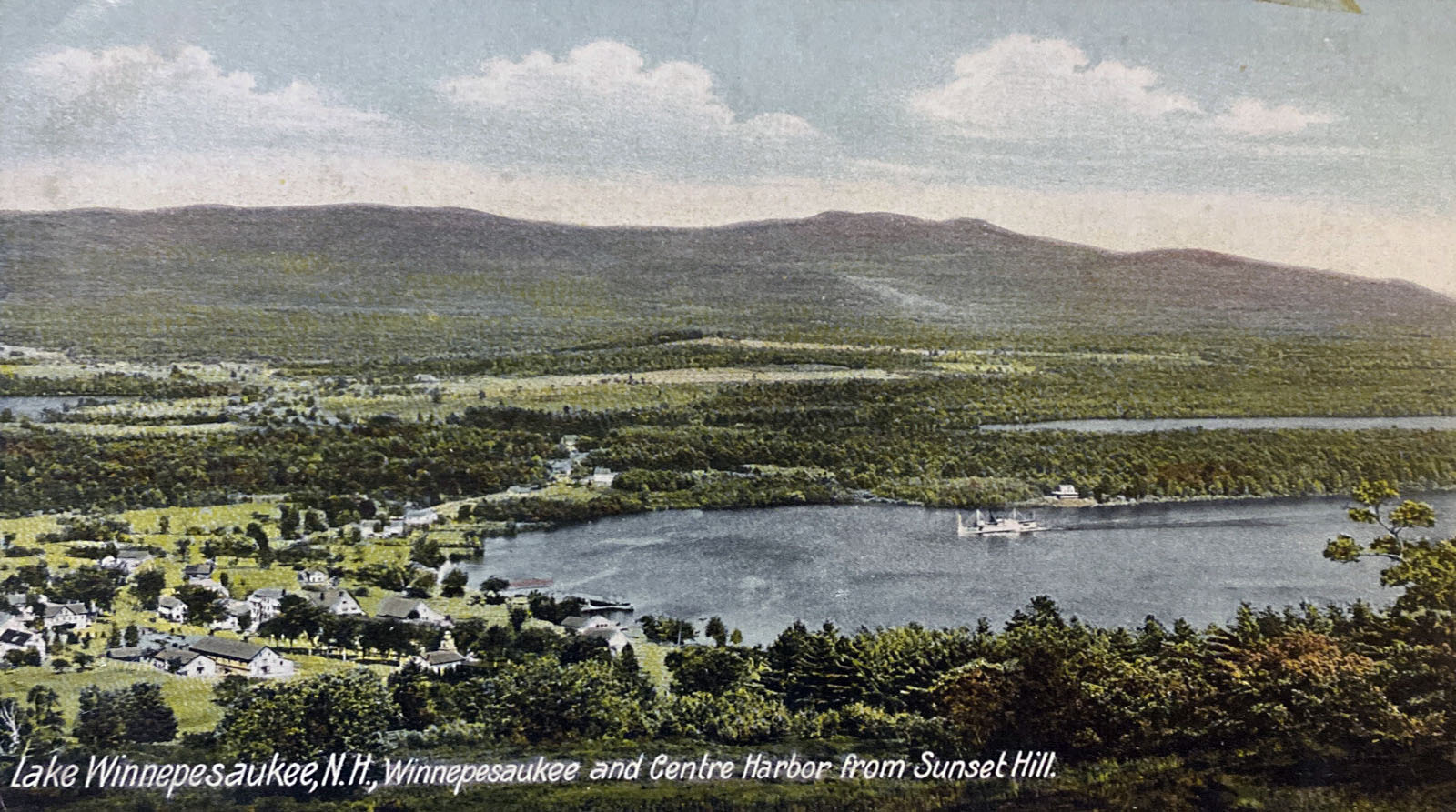 The famed poet of Lake Winnipesaukee, John Greenleaf Whittier, was a frequent visitor to Center Harbor, where he stayed at the Sturtevant farm at the top of Sunset Hill, about a mile and a half from Center Harbor village, on what is now Dane Rd (Route 25B). Greenleaf spent many summers there. The farm had a sweeping view over Squam Lake, which, being to the west of the farm, would also be the direction in which the sun would set. Whittier enjoyed the huge white pine on the farm grounds, which he memorialized in a poem titled “The Wood Giant”. The tree stood alone in the middle of the pasture, and the reason that it had been spared was its misshapen trunk. Early in the tree’s life, an animal had damaged it so that it had no commercial value, but it still grew robustly, resembling a candelabrum. The tree came to be known as the Whittier Pine, and survived until 1950, when it was struck by lighting. Below are many postcards of the Whittier Pine. A corner of Squam Lake is seen in a couple of the postcards.