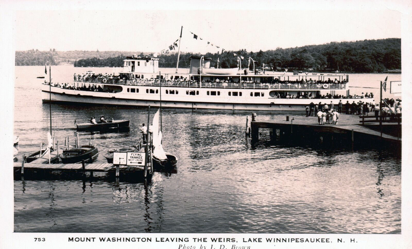 A color linen postcard, postmarked in 1949, shows the “M.V. Mount Washington leaving the Weirs, Lake Winnipesaukee, N.H.”. The postcard caption adds, “A trip always to be remembered.” A crowd at Irwin’s Winnipesaukee Gardens watches the Mount departing. A sign for the Flying Yankee is seen on the docks. The time indicated for the next Flying Yankee cruise, at 3:30pm, is the same as in the previous postcard.