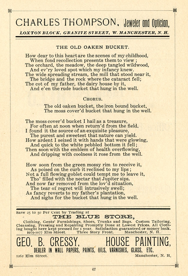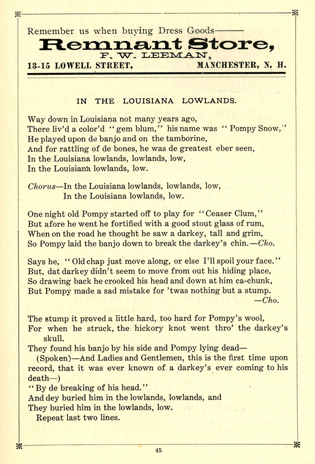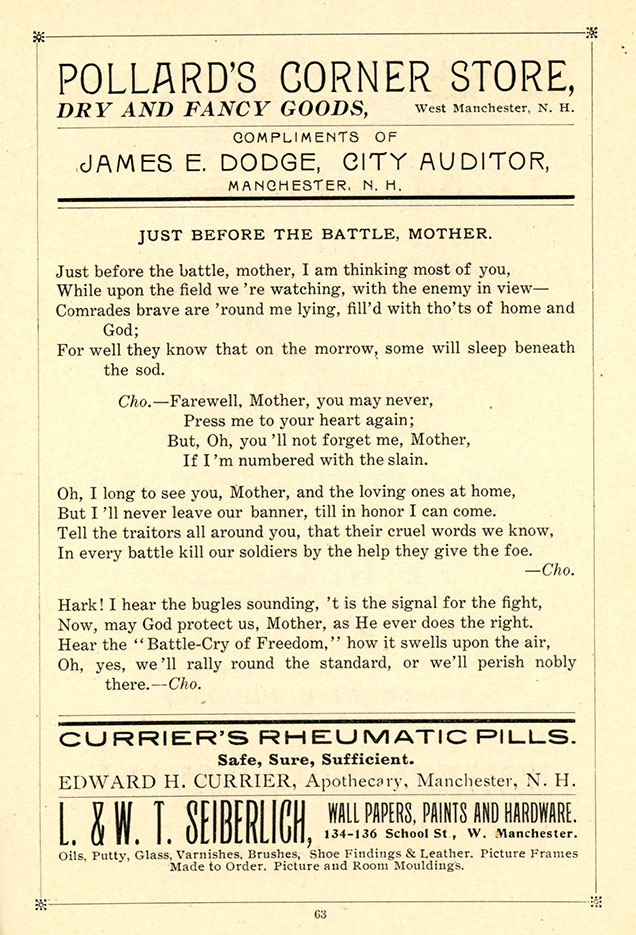 Camp Song Lyrics Lyrics scanned from the 1906-1908 reunion programs. Click on each song title for more info. Tenting On the Old Campground (1863) Tramp! Tramp! Tramp! (1864) Battle Cry of Freedom (1862) Marching Through Georgia (1865) Columbia, The Gem of the Ocean (1843) Old Folks at Home (1851) America (1831) When Johnny Comes Marching Home (1863) In the Louisiana Lowlands (1859) Just Before the Battle, Mother (1862) The Old Oaken Bucket (1834) The Star Spangled Banner (1814)