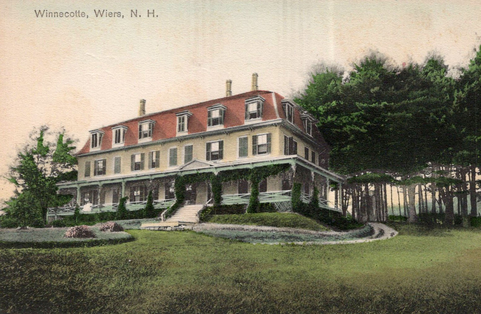 The illustration may have been drawn by J. Warren Thyng. Thyng was the Principal of the Salem, MA art school, and a frequent visitor to the Weirs. In 1882, he organized a four week summer art school at the Weirs. The illustration appeared in an advertisement in the art school brochure. According to the advertisement, the name Winnecoette meant “Beautiful Pine Place”. The ad continued, “The Winnecoette is delightfully located upon the western slope, near the Weirs. Its situation commands one of the most extensive lake and mountain views in New Hampshire; and for healthfulness, beauty of prospect, and attractiveness, it is unsurpassed.” The hotel was operated that summer by a Mr. Irving W. Doolittle, who may have been the original owner.