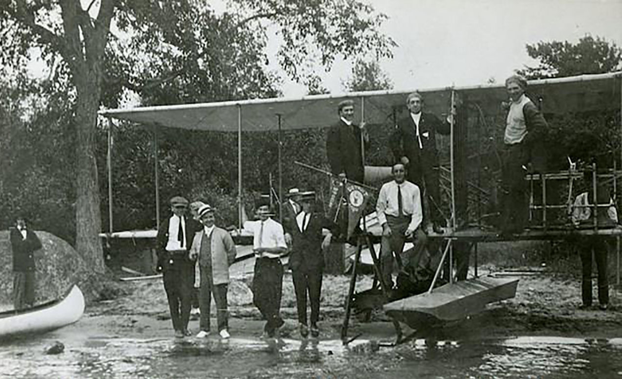 Note the propeller of the seaplane in the photo. It is mounted in a “pusher” configuration, with the engine in front of the prop, unlike modern seaplanes, where the propeller is in a “tractor” configuration, with the engine mounted behind the propeller. Note also that this primitive seaplane, or “flying boat“, landed on its belly.