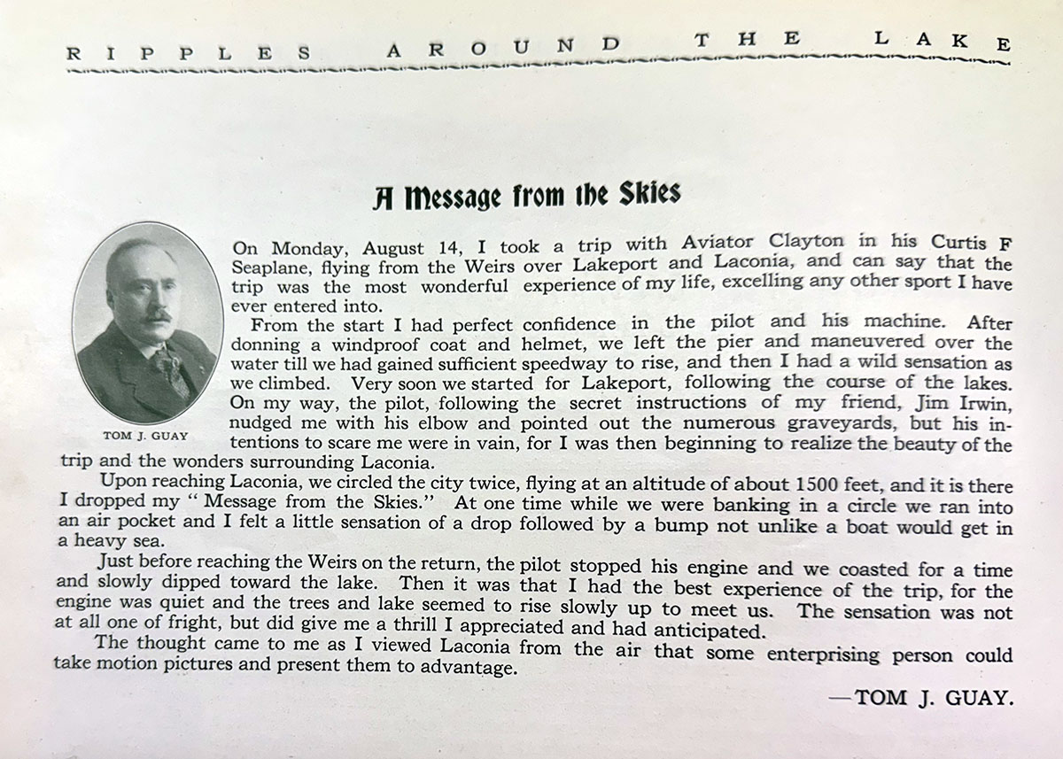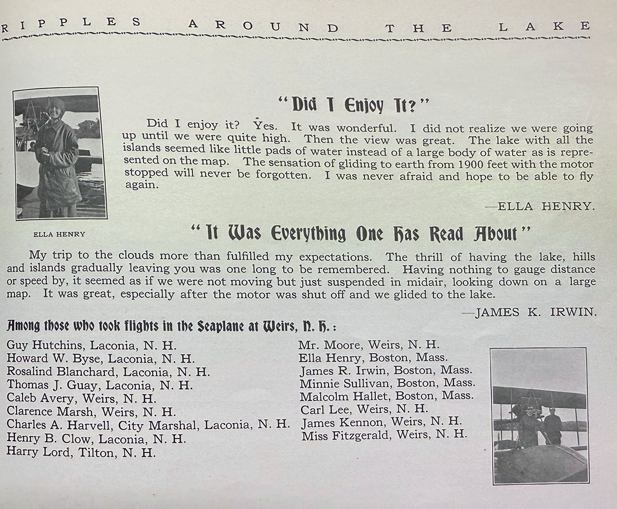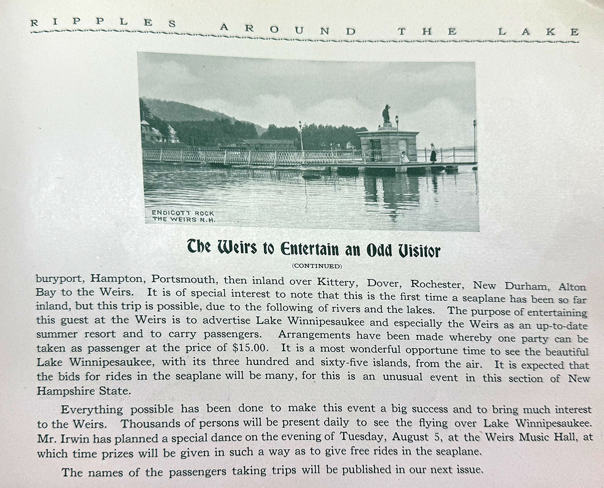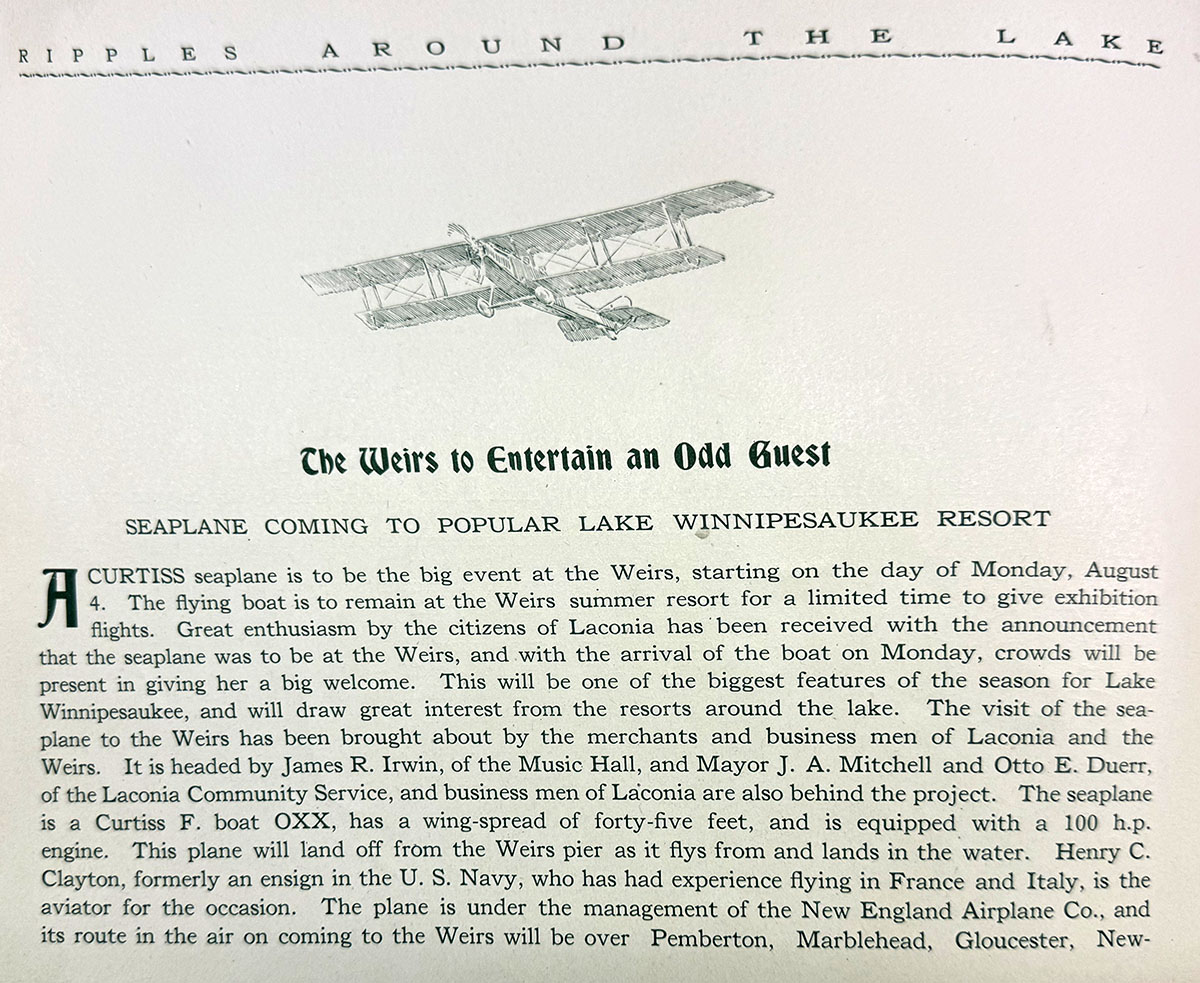 The following, two-page article, “The Weirs to Entertain a Strange Guest”, appeared in a July, 1919 copy of the weekly magazine “Ripples around the Lake”. This was the first year of the four-year run of the orginal seaplane ride in Weirs Beach.