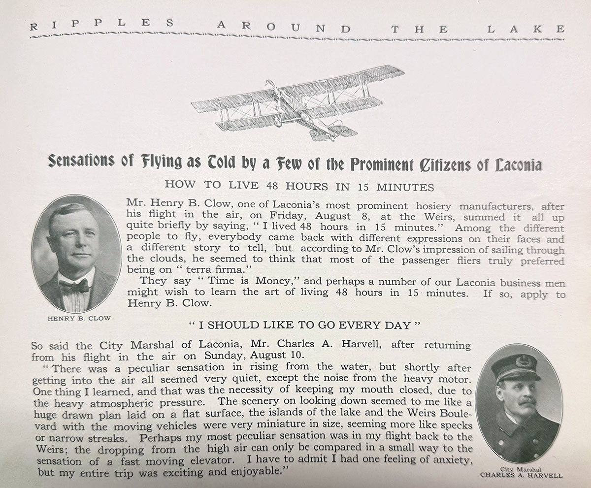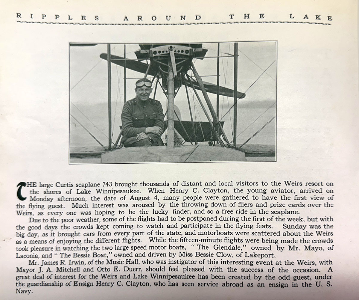 A follow-up page from “Ripples” on the visit of aviator Henry C. Clayton for the inaguaral seaplane rides on August 4, 1919.