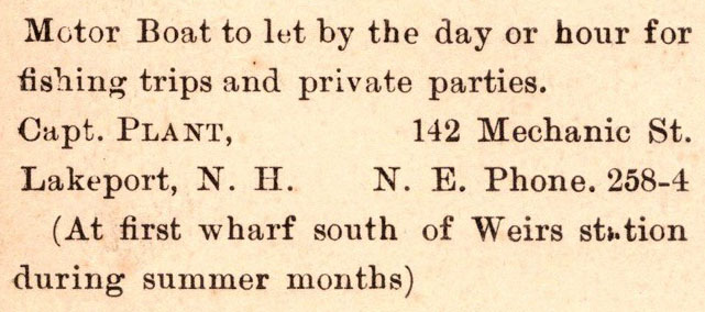 Although the focus of the photographer’s attention in this photo is the driver and passenger of a small boat, it is more interesting for what can be seen in the background. One can see here an opening under the freight house loading platform that is wide enough for freight cars. Underneath the freight house on the right, a doorway can be seen, where freight could be delivered to the basement of the Weirs Cafe, and then on to the Mount Washington steamer.