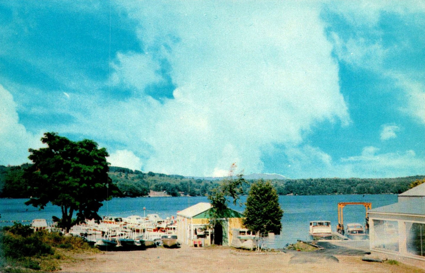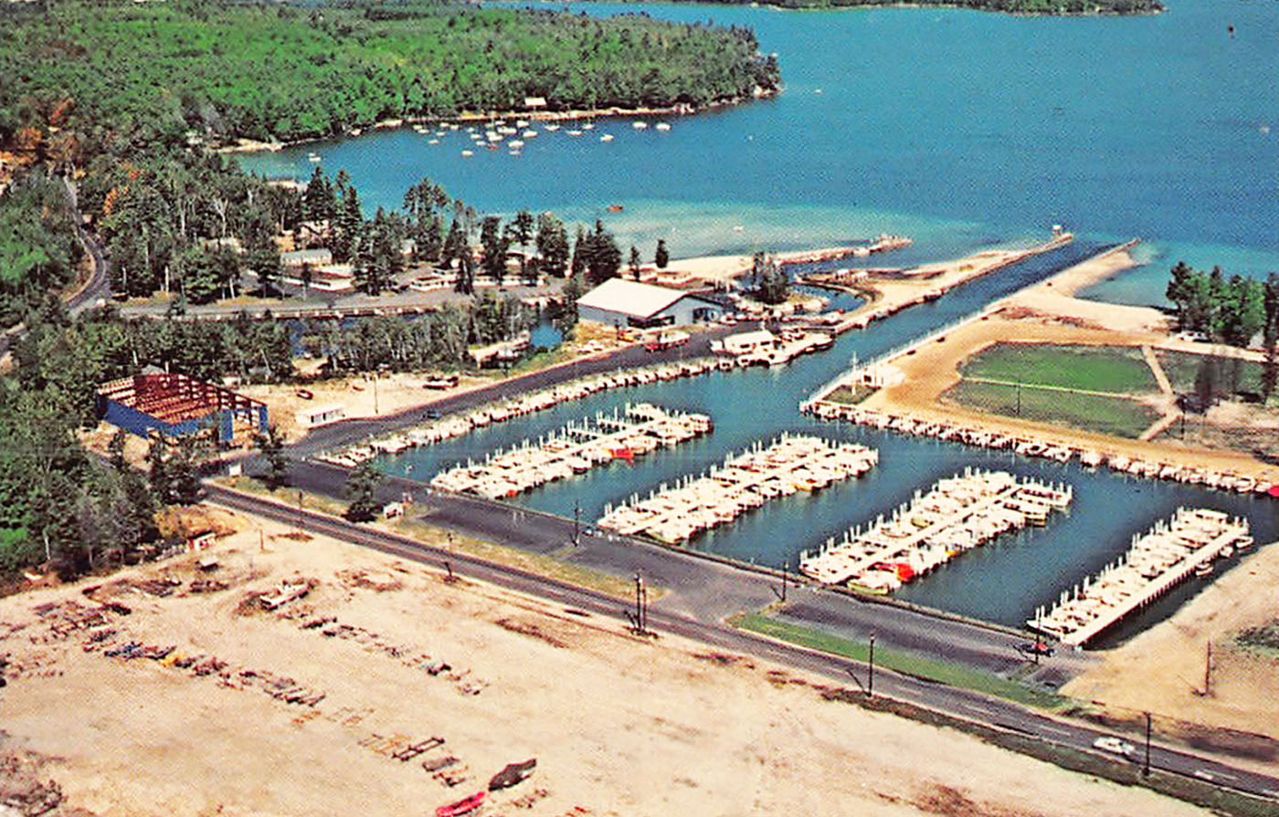 Sailboats gather in Weirs Bay, circa 1960. A waterski jump ramp is floating just a few feet away from the public docks.