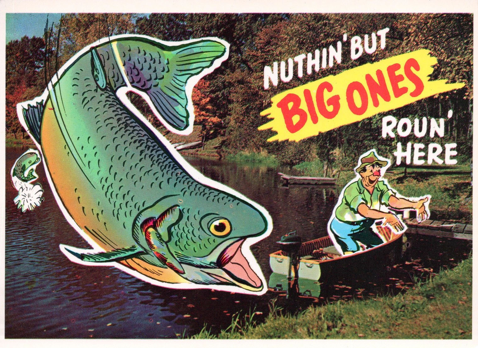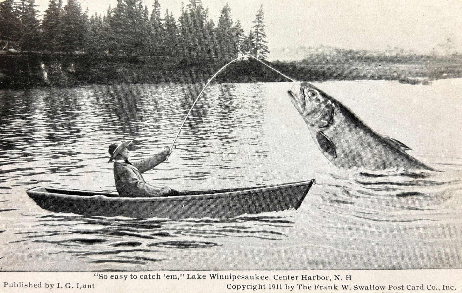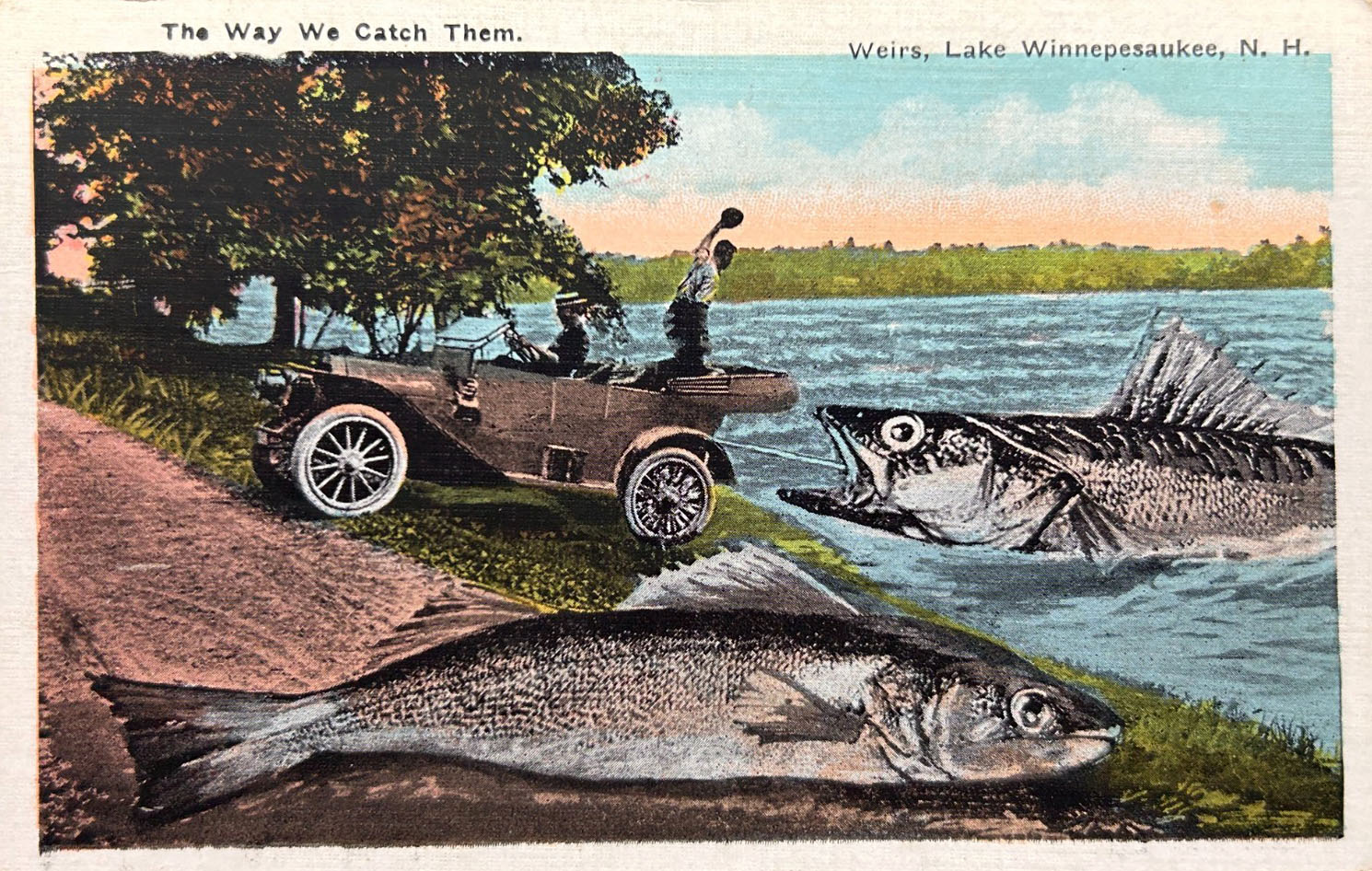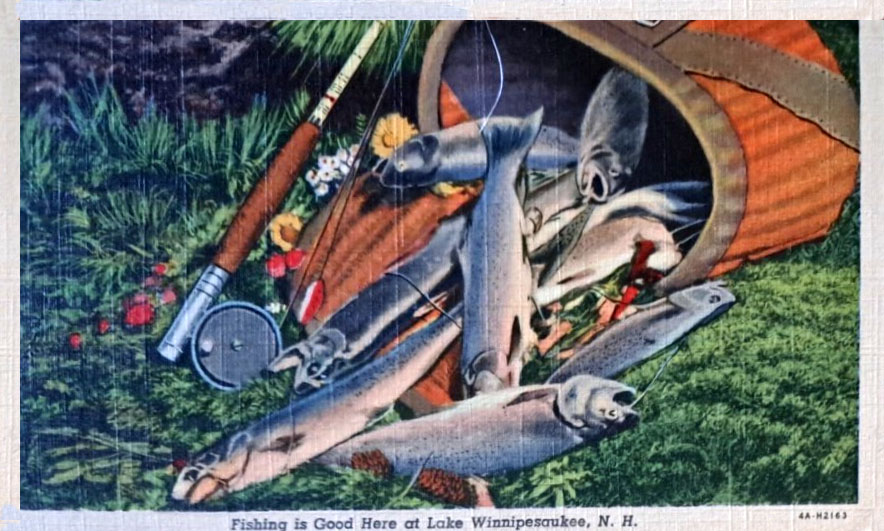 Generic postcards all extol about how good the fishing is in Lake Winnipesaukee and its surrounding towns. Some cards humorously exaggerate the point, with depictions of giant fish being caught.