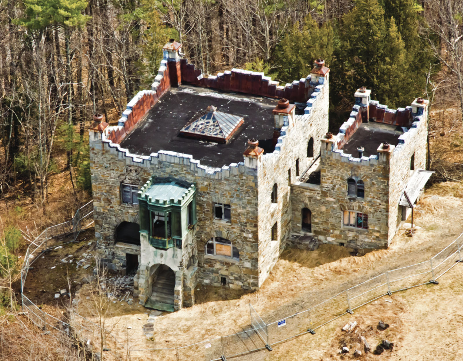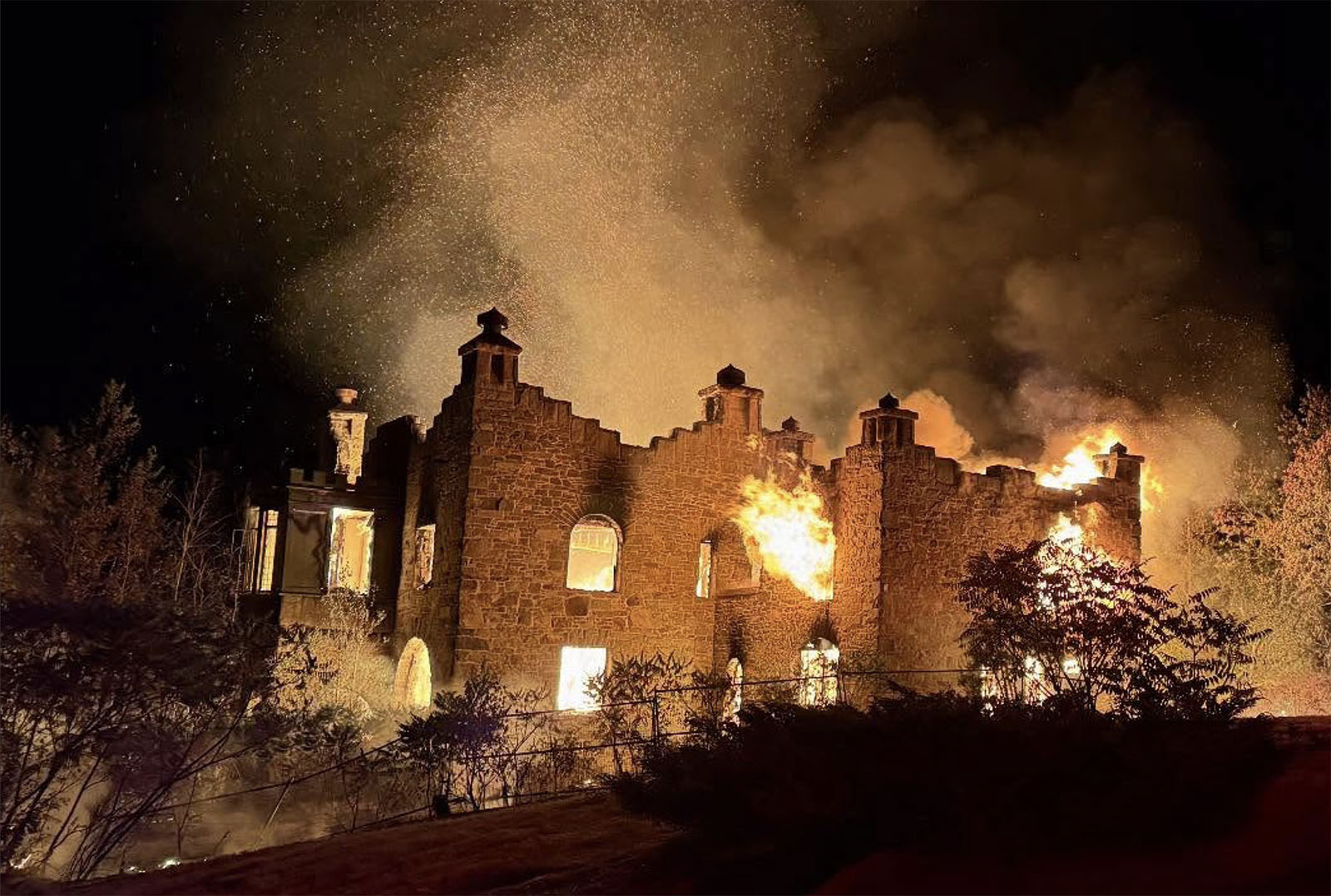 On August 27, 2025, an extensive fire gutted the castle, which had fallen into a state of severe disrepair after having remained uninhabited since 1960 and vandalized numerous times. While the stone walls were left standing, the fire department declared the remains hazardous, and ordered the castle to be torn down. Aerial photo by Bill Hemmell, taken in 2014. Fire photo by Gilford Firefighters Local 3517.