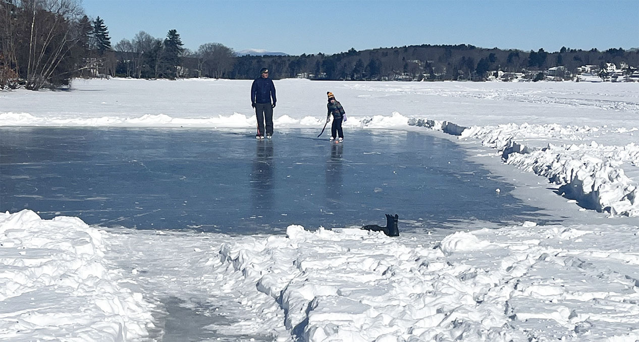 A father and daughter are playing an ice ball game at the skating rink on Lake Opechee in January, 2026.